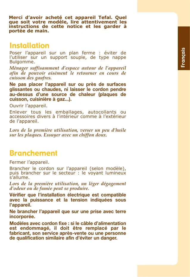 www.tefal.com Installation Poser l’appareil sur un plan ferme : éviter de l’utiliser sur un support souple, de type nappe Bulgomme. Ménager suffisamment d’espace autour de l’appareil afin de pouvoir aisément le retourner en cours de cuisson des gaufres. Ne pas placer l’appareil sur ou près de surfaces glissantes ou chaudes, ni laisser le cordon pendre au-dessus d’une source de chaleur (plaques de cuisson, cuisinière à gaz...). Ouvrir l’appareil. Enlever tous les emballages, autocollants ou accessoires divers à l’intérieur comme à l’extérieur de l’appareil. Lors de la première utilisation, verser un peu d’huile sur les plaques. Essuyer avec un chiffon doux. Branchement Fermer l’appareil. Brancher le cordon sur l’appareil (selon modèle), puis brancher sur le secteur : le voyant lumineux s’allume. Lors de la première utilisation, un léger dégagement d’odeur ou de fumée peut se produire. Vérifier que l’installation électrique est compatible avec la puissance et la tension indiquées sous l’appareil. Ne brancher l’appareil que sur une prise avec terre incorporée. Modèles avec cordon fixe : si le câble d’alimentation est endommagé, il doit être remplacé par le fabricant, son service après-vente ou une personne de qualification similaire afin d’éviter un danger. Français Merci d’avoir acheté cet appareil Tefal. Quel que soit votre modèle, lire attentivement les instructions de cette notice et les garder à portée de main. Cuisson Selon modèle, régler le thermostat sur la position désirée. Laisser préchauffer l’appareil :