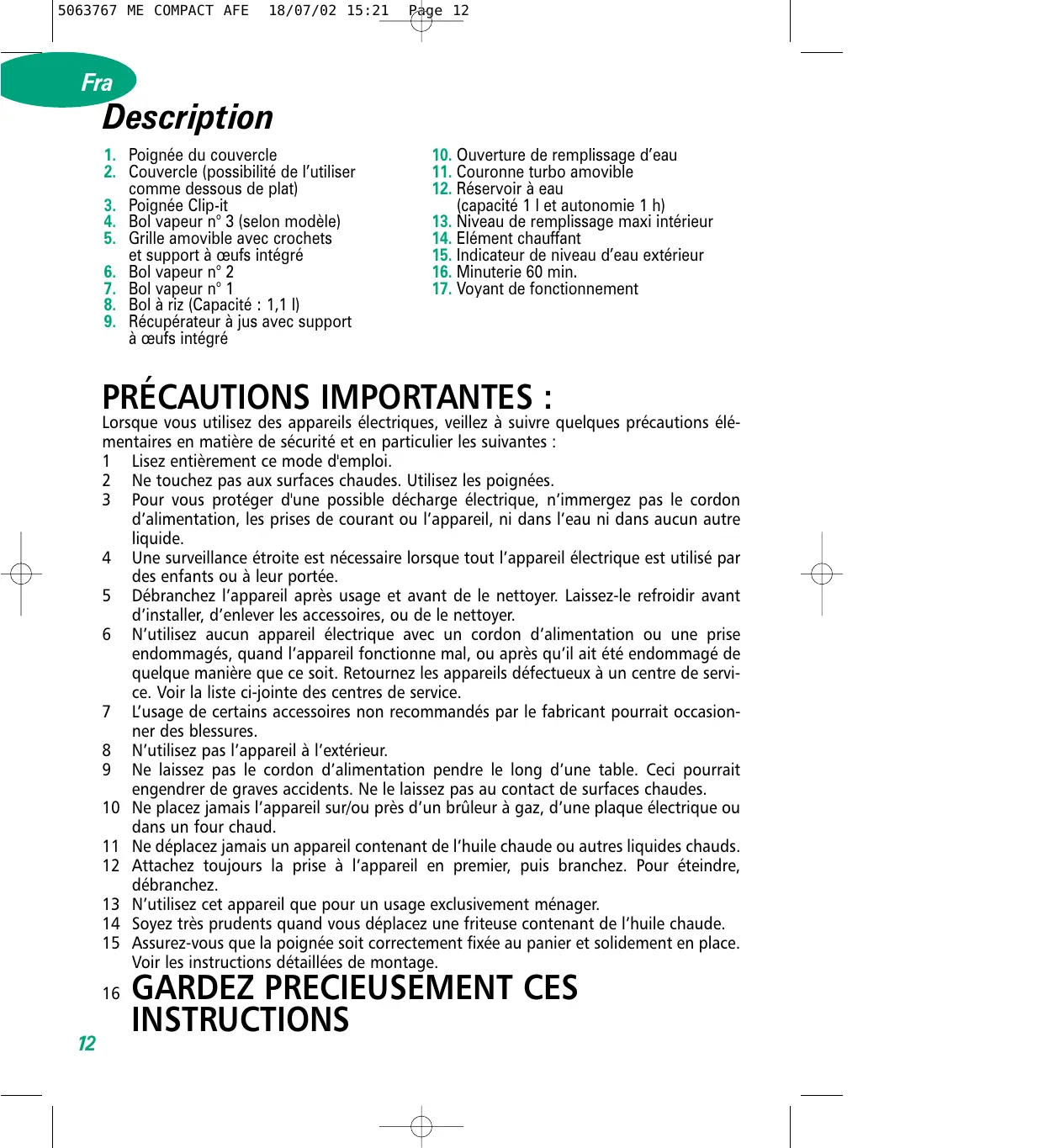 PRÉCAUTIONS IMPORTANTES : Lorsque vous utilisez des appareils électriques, veillez à suivre quelques précautions élémentaires en matière de sécurité et en particulier les suivantes : 1 Lisez entièrement ce mode d'emploi. 2 Ne touchez pas aux surfaces chaudes. Utilisez les poignées. 3 Pour vous protéger d'une possible décharge électrique, n’immergez pas le cordon d’alimentation, les prises de courant ou l’appareil, ni dans l’eau ni dans aucun autre liquide. 4 Une surveillance étroite est nécessaire lorsque tout l’appareil électrique est utilisé par des enfants ou à leur portée. 5 Débranchez l’appareil après usage et avant de le nettoyer. Laissez-le refroidir avant d’installer, d’enlever les accessoires, ou de le nettoyer. 6 N’utilisez aucun appareil électrique avec un cordon d’alimentation ou une prise endommagés, quand l’appareil fonctionne mal, ou après qu’il ait été endommagé de quelque manière que ce soit. Retournez les appareils défectueux à un centre de service. Voir la liste ci-jointe des centres de service. 7 L’usage de certains accessoires non recommandés par le fabricant pourrait occasionner des blessures. 8 N’utilisez pas l’appareil à l’extérieur. 9 Ne laissez pas le cordon d’alimentation pendre le long d’une table. Ceci pourrait engendrer de graves accidents. Ne le laissez pas au contact de surfaces chaudes. 10 Ne placez jamais l’appareil sur/ou près d’un brûleur à gaz, d’une plaque électrique ou dans un four chaud. 11 Ne déplacez jamais un appareil contenant de l’huile chaude ou autres liquides chauds. 12 Attachez toujours la prise à l’appareil en premier, puis branchez. Pour éteindre, débranchez. 13 N’utilisez cet appareil que pour un usage exclusivement ménager. 14 Soyez très prudents quand vous déplacez une friteuse contenant de l’huile chaude. 15 Assurez-vous que la poignée soit correctement fixée au panier et solidement en place. Voir les instructions détaillées de montage.