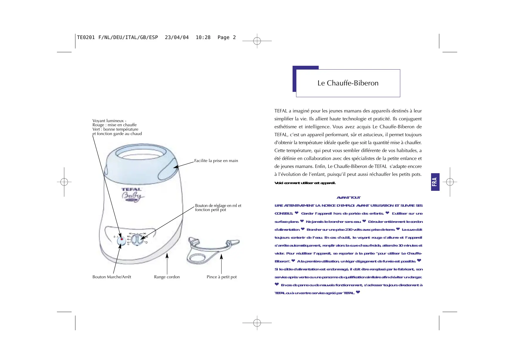 LIRE ATTENTIVEMENT LA NOTICE D'EMPLOI AVANT UTILISATION ET SUIVRE SES CONSEILS.♥ Garder l'appareil hors de portée des enfants.♥ L'utiliser sur une surface plane.♥ Ne jamais le brancher sans eau.♥ Derouler entierement le cordon d'alimentation.♥ Brancher sur une prise 230 volts avec prise de terre.♥ La cuve doit toujoursContainir de I'eau. En cas d'oubli, le voyant rouge s'allume et l'appareil s'arrête automatiquement, replir alors la cuve d'eau froide, attendre 10 minutes et vider. Pour réutiliser l'appareil, se reporter à la partie "pour utiliser Le Chauffe-Biberon".♥ A la première utilisation, un léger dégagement de fumée est possible.♥ Si le cable d'alimentation est endommagé, il doit être replacé par le fabricant, son service après vente ou une personne de qualification similaire afin d'éviter un danger.♥ En cas de panne ou de mauvais fonctionnement, s'adresser toujours directement à TEFAL ou à un centre service/agree par TEFAL.