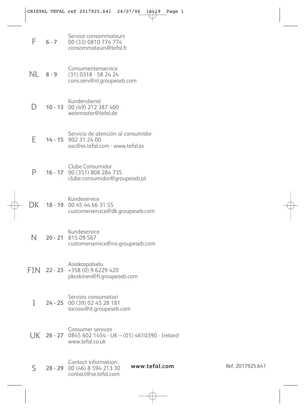 6-7 Service consommateurs 00 (33) 0810 774 774 consommateurs@tefal.fr