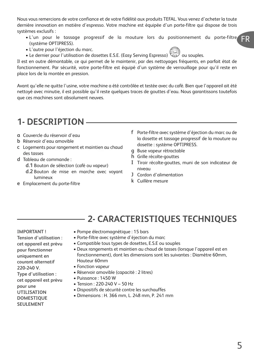 Nous vous remercions de votre confiance et de votre fidélité aux produits TEFAL. Vous venez d'acheter la toute dernière innovation en matière d'espresso. Notre machine est équipée d'un porte-filtre qui dispose de trois systèmes exclusifs :