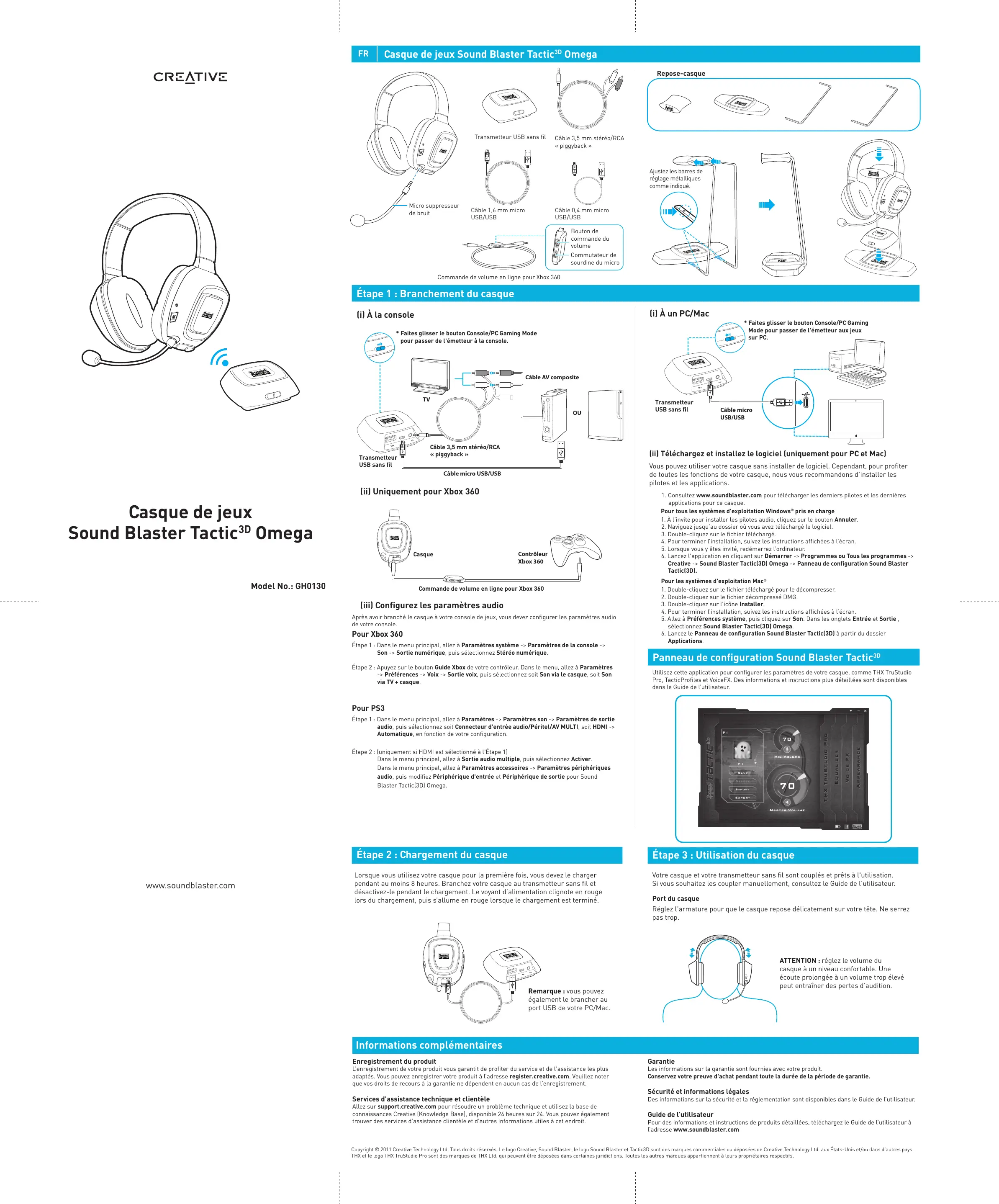 Votre casque et votre transmetteur sans fil sont couplés et prêts à l'utilisation. Si vous souhaitez les coupler manuellement, consultez le Guide de l'utilisateur. Port du casque Réglez l'armature pour que le casque repose délicatement sur votre tête. Ne serrez pas trop. ATTENTION : réglez le volume du casque à un niveau confortable. Une écoute prolongée à un volume trop élevé peut entraîner des pertes d'audition. Remarque : vous pouvez également le brancher au port USB de votre PC/Mac. Informations complémentaires Enregistrement du produit L’enregistrement de votre produit vous garantit de profiter du service et de l'assistance les plus adaptés. Vous pouvez enregistrer votre produit à l’adresse register.creative.com. Veuillez noter que vos droits de recours à la garantie ne dépendent en aucun cas de l’enregistrement. Services d’assistance technique et clientèle Allez sur support.creative.com pour résoudre un problème technique et utilisez la base de connaissances Creative (Knowledge Base), disponible 24 heures sur 24. Vous pouvez également trouver des services d’assistance clientèle et d’autres informations utiles à cet endroit. Garantie Les informations sur la garantie sont fournies avec votre produit. Conservez votre preuve d'achat pendant toute la durée de la période de garantie. Sécurité et informations légales Des informations sur la sécurité et la réglementation sont disponibles dans le Guide de l’utilisateur. Guide de l’utilisateur Pour des informations et instructions de produits détaillées, téléchargez le Guide de l’utilisateur à l’adresse www.soundblaster.com Copyright © 2011 Creative Technology Ltd. Tous droits réservés. Le logo Creative, Sound Blaster, le logo Sound Blaster et Tactic3D sont des marques commerciales ou déposées de Creative Technology Ltd. aux États-Unis et/ou dans d'autres pays. THX et le logo THX TruStudio Pro sont des marques de THX Ltd. qui peuvent être déposées dans certaines juridictions. Toutes les autres marques appartiennent à leurs propriétaires respectifs.