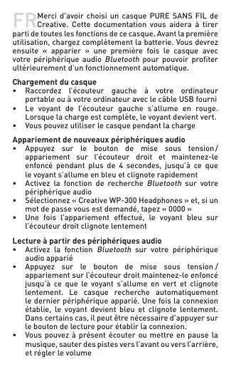 • Raccordez l’écouteur gauche à votre ordinateur portable ou à votre ordinateur avec le câble USB fourni • Le voyant de l’écouteur gauche s’allume en rouge. Lorsque la charge est complète, le voyant devient vert. • Vous pouvez utiliser le casque pendant la charge Appariement de nouveaux périphériques audio • Appuyez sur le bouton de mise sous tension / appariement sur l’écouteur droit et maintenez-le enfoncé pendant plus de 4 secondes, jusqu’à ce que le voyant s’allume en bleu et clignote rapidement • Activez la fonction de recherche Bluetooth sur votre périphérique audio • Sélectionnez « Creative WP-300 Headphones » et, si un mot de passe vous est demandé, tapez « 0000 » • Une fois l’appariement effectué, le voyant bleu sur l’écouteur droit clignote lentement Lecture à partir des périphériques audio • Activez la fonction Bluetooth sur votre périphérique audio apparié • Appuyez sur le bouton de mise sous tension / appariement sur l’écouteur droit maintenez-le enfoncé jusqu’à ce que le voyant s’allume en vert et clignote lentement. Le casque recherche automatiquement le dernier périphérique apparié. Une fois la connexion établie, le voyant devient bleu et clignote lentement. Dans certains cas, il peut être nécessaire d’appuyer sur le bouton de lecture pour établir la connexion. • Vous pouvez à présent écouter ou mettre en pause la musique, sauter des pistes vers l’avant ou vers l’arrière, et régler le volume