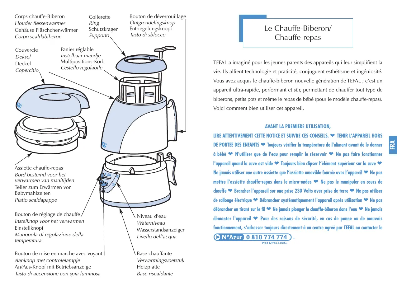 LIRE ATTENTIVEMENT CETTE NOTICE ET SUIVRE CES CONSEILS. TENIR L'APPEARIL HORS DE PORTEE DES ENFANTS Toujours vérifier la températe de l'aliment avant de le donneur à bébé N'utiliser que de l'eau pour replir le réservoir Ne pas faire fonctionner l'appareil quand la cuve est vide Toujours bien clipser l'élement supérieur sur la cuve Ne jamais utiliser une autre assiette que l'assiette amovible fournie avec l'appareil Ne pasmettre l'assiette chauffe-repas dans le micro-ondes Ne pas le manipuler en cours de chauffe Brancher l'appareil sur une prise 230 Volts avec prise de terre Ne pas utiliser de rallongé électrique Débrancher systématiquement l'appareil après utilisation Ne pas débrancher en tirant sur le fil Ne jamais plonger le chauffe-biberon dans l'eau Ne jamais démonter l'appareil Pour des raisons de sécurité, en cas de panne ou de mauvais fonctionnement, s'adresser toujours directement à un centre agréé par TEFAL ou contacter le