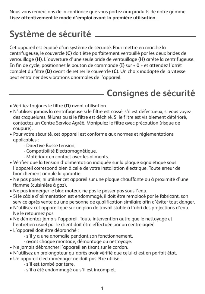 Cet apparéil est équiné d'un système de sécurité. Pourmettre en marche la centrifugeuse,le couvercle (C) doit être parfaitement verrouillépar les deux brides de verrouillage (H).L'ouverture d'une seule bride de verrouillage (H) arrêté la centrifugeuse. En fin de cycle,positionnez le bouton de commande (I) sur « 0 » et attendez l'arrêt complet du filtre (D) avant de retarder le couvercle (C).Unchioix inadapte de la vitesse peut entraîner des vibrations anormales de l' apparéil.