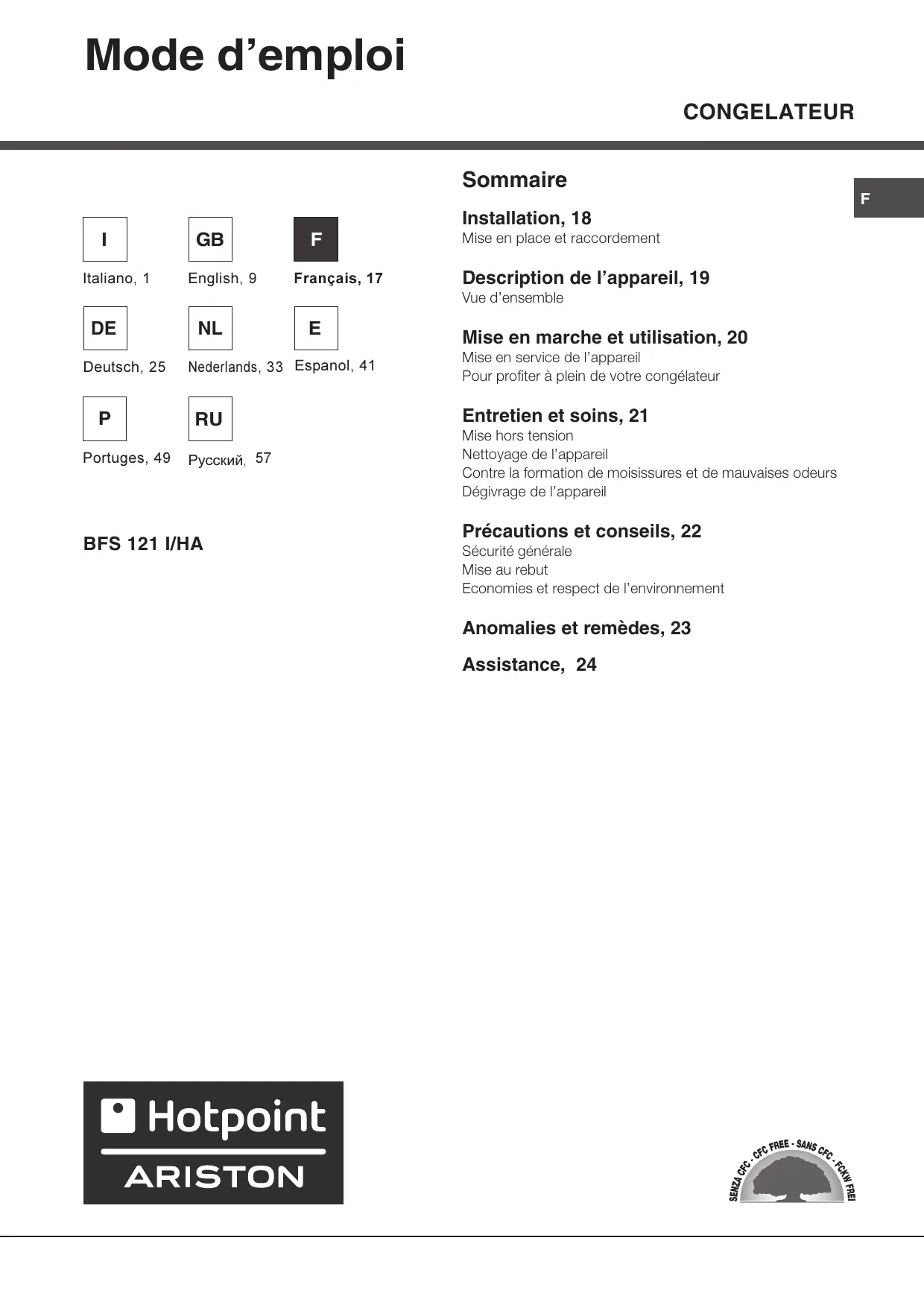 BFS 121 I/HA - Congélateur HOTPOINT - Notice d'utilisation et mode d'emploi gratuit