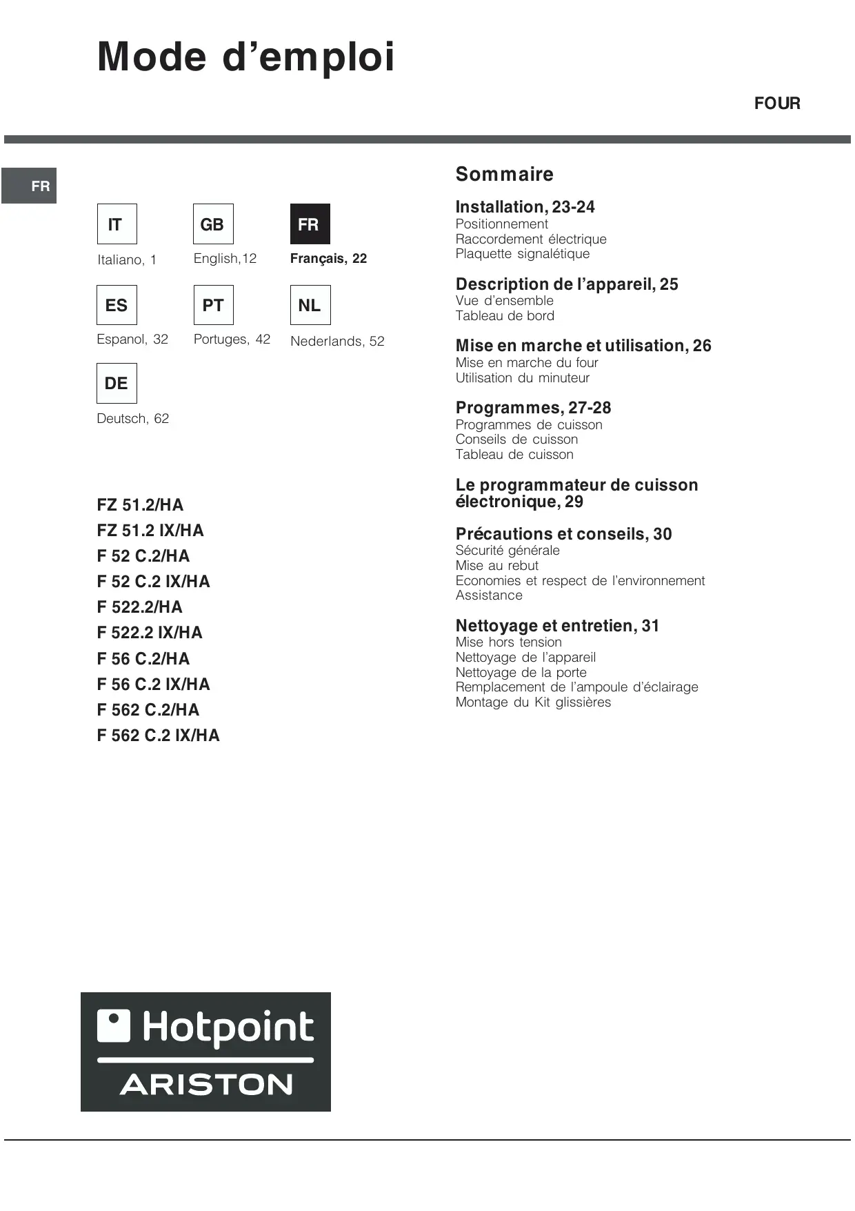 Retrouvez gratuitement la notice de l'appareil FZ 51.2 IX/HA HOTPOINT au format PDF.