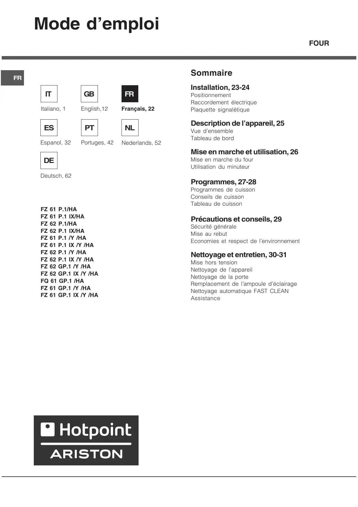 MODE D'EMPLOI FZ 62 GP.1 IX /Y /HA HOTPOINT