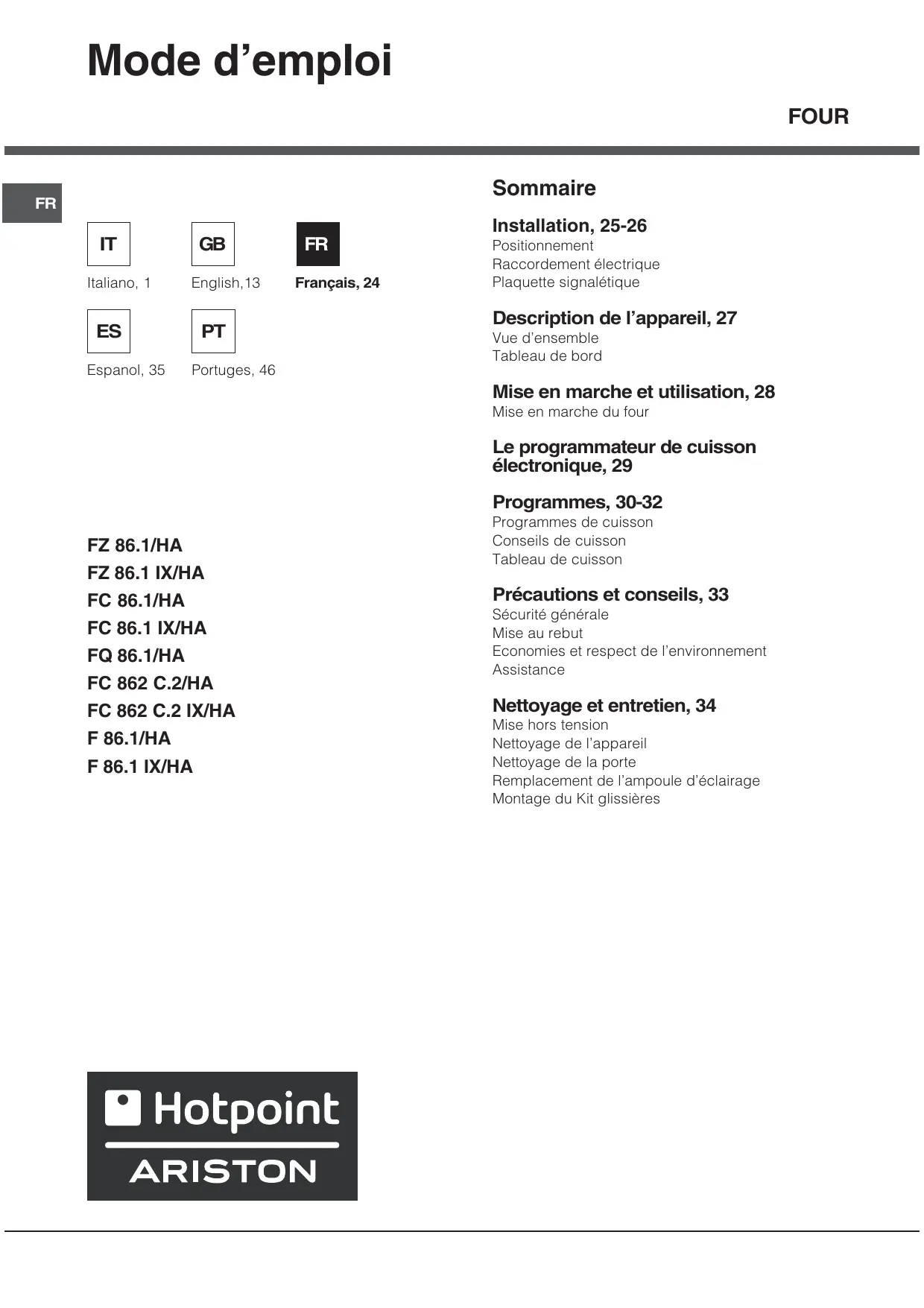 Retrouvez gratuitement la notice de l'appareil FZ 86.1 IX/HA HOTPOINT au format PDF.