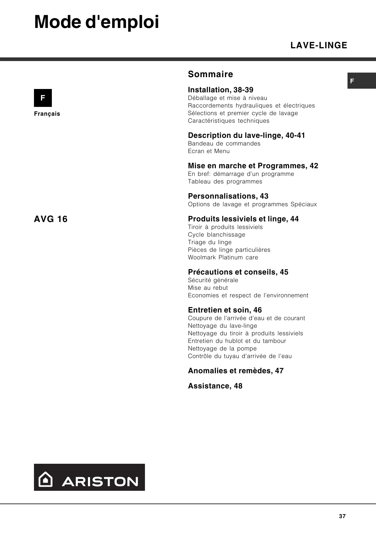Installation, 38-39 Déballage et mise à niveau Raccordements hydrauliques et électriques Sélections et premier cycle de lavage Caractéristiques techniques Description du lave-linge, 40-41 Bandeau de commandes Ecran et Menu Mise en marche et Programmes, 42 En bref: démarrage d'un programme Tableau des programmes Personnalisations, 43 Options de lavage et programmes Spéciaux AVG 16 Produits lessiviels et linge, 44 Tiroir à produits lessiviels Cycle blanchissage Triage du linge Pièces de linge particulières Woolmark Platinum care Précautions et conseils, 45 Sécurité générale Mise au rebut Economies et respect de l'environnement Entretien et soin, 46 Coupure de l'arrivée d'eau et de courant Nettoyage du lave-linge Nettoyage du tiroir à produits lessiviels Entretien du hublot et du tambour Nettoyage de la pompe Contrôle du tuyau d'arrivée de l'eau Anomalies et remèdes, 47 Assistance, 48