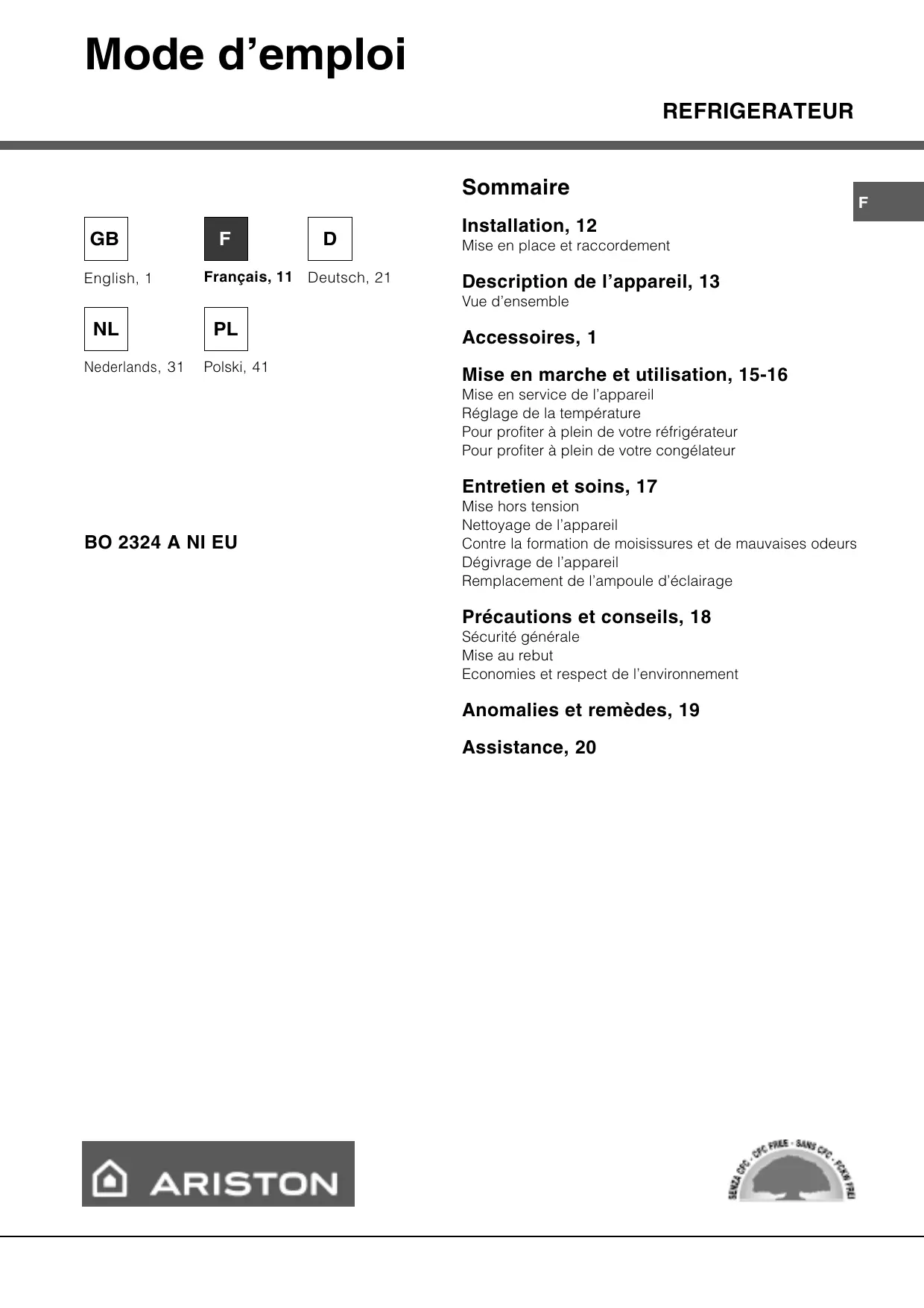 MODE D'EMPLOI BO 2324 A N I EU HOTPOINT