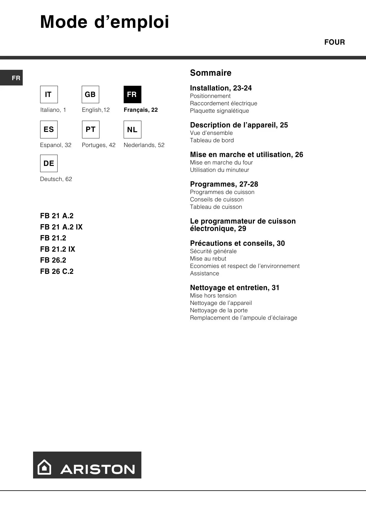 FB 26.2 - Four HOTPOINT - Notice d'utilisation et mode d'emploi gratuit