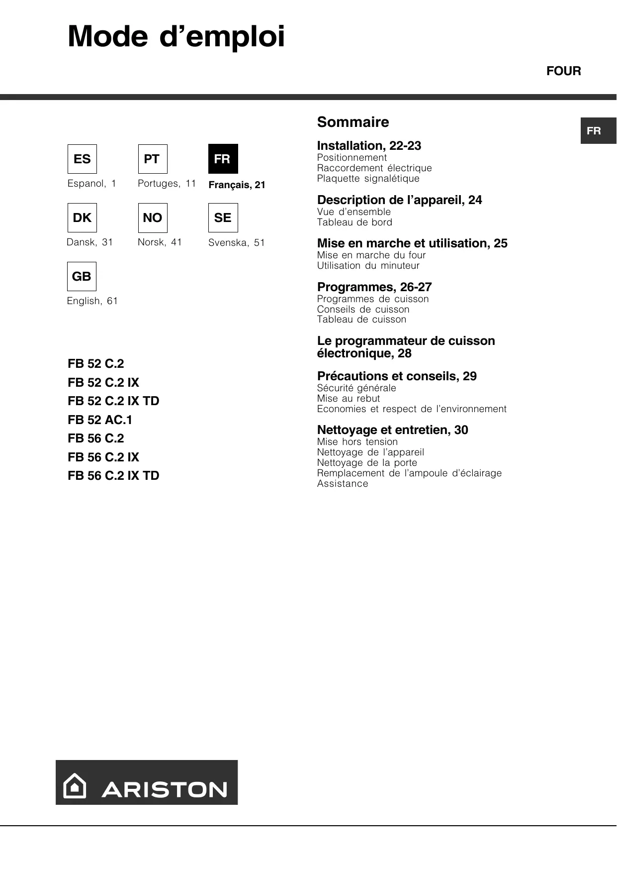 FB 52 C.2 IX - Four encastrable HOTPOINT - Notice d'utilisation et mode d'emploi gratuit