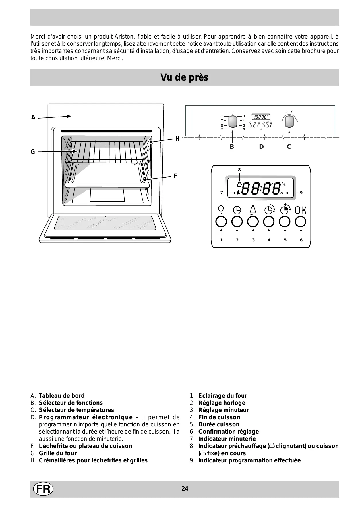 Tableau de bord Sélecteur de fonctions Sélecteur de températures Programmateur électronique - Il per met de programmer n’importe quelle fonction de cuisson en sélectionnant la durée et l’heure de fin de cuisson. Il a aussi une fonction de minuterie. F. Lèchefrite ou plateau de cuisson G. Grille du four H. Crémaillères pour lèchefrites et grilles