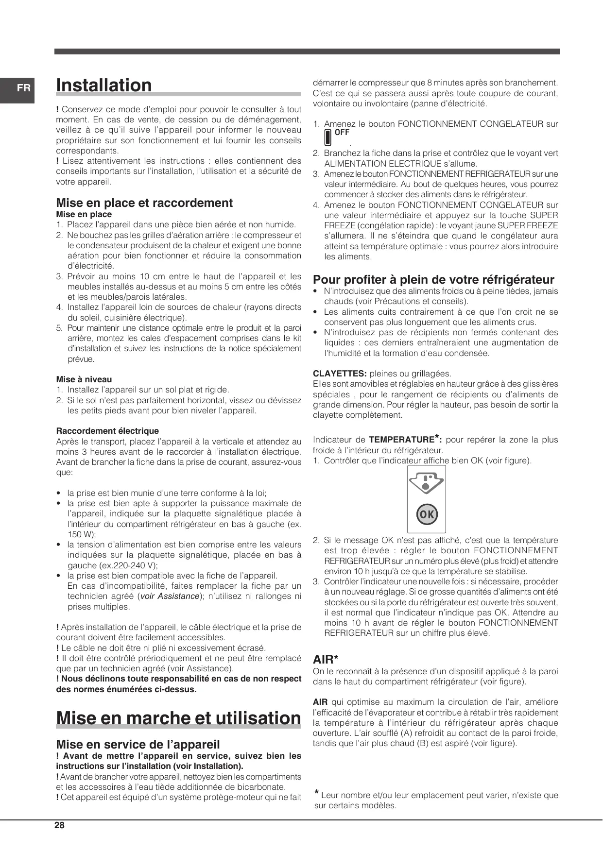 à un nouveau réglage. Si de grosse quantités d’aliments ont été stockées ou si la porte du réfrigérateur est ouverte très souvent, il est normal que l’indicateur n’indique pas OK. Attendre au moins 10 h avant de régler le bouton FONCTIONNEMENT REFRIGERATEUR sur un chiffre plus élevé. AIR* On le reconnaît à la présence d’un dispositif appliqué à la paroi dans le haut du compartiment réfrigérateur (voir figure). AIR qui optimise au maximum la circulation de l’air, améliore l’efficacité de l’évaporateur et contribue à rétablir très rapidement la température à l’intérieur du réfrigérateur après chaque ouverture. L’air soufflé (A) refroidit au contact de la paroi froide, tandis que l’air plus chaud (B) est aspiré (voir figure).