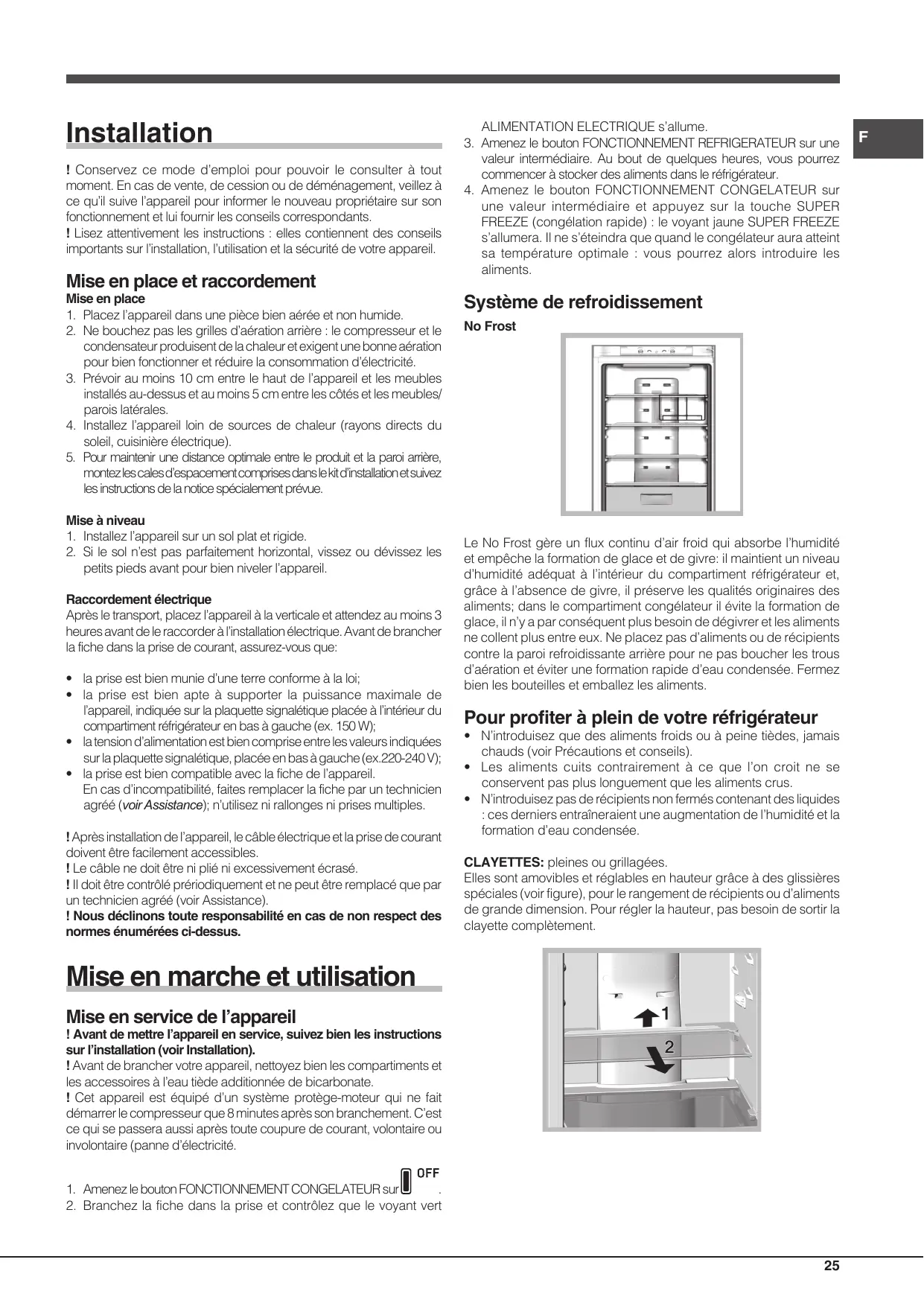 une valeur intermédiaire et appuyez sur la touche SUPER FREEZE (congélation rapide) : le voyant jaune SUPER FREEZE s’allumera. Il ne s'éteindra que quand le congélateur aura atteint sa température optimale : vous pourrez alors introduire les aliments. Système de refroidissement No Frost Le No Frost gère un flux continu d'air froid qui absorbe l'humidité et empêche la formation de glace et de givre: il maintient un niveau d'humidité adéquat à l'intérieur du compartiment réfrigérateur et, grâce à l'absence de givre, il préserve les qualités originaires des aliments; dans le compartiment congélateur il évite la formation de glace, il n'y a par conséquent plus besoin de dégivrer et les aliments ne collent plus entre eux. Ne placez pas d'aliments ou de récipients contre la paroi refroidissante arrière pour ne pas boucher les trous d'aération et éviter une formation rapide d'eau condensée. Fermez bien les bouteilles et emballez les aliments. Pour profiter à plein de votre réfrigérateur + N'introduisez que des aliments froids ou à peine tièdes, jamais chauds (voir Précautions et conseils). + Les aliments cuits contrairement à ce que l'on croit ne se conservent pas plus longuement que les aliments crus. + N'introduisez pas de récipients non fermés contenant des liquides : ces derniers entraîneraient une augmentation de l'humidité et la formation d'eau condensée. CLAYETTES: pleines ou grillagées. Elles sont amovibles et réglables en hauteur grâce à des glissières spéciales (voir figure), pour le rangement de récipients ou d'aliments de grande dimension. Pour régler la hauteur, pas besoin de sortir la clayette complètement.