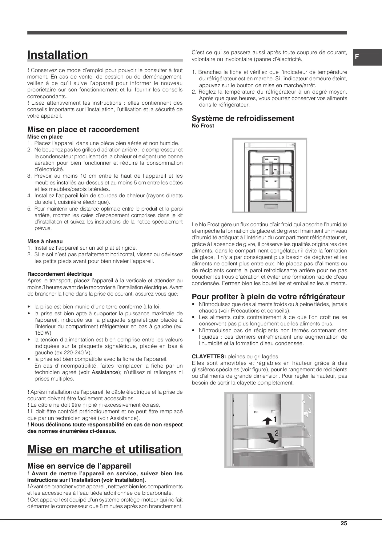 - la prise est bien compatible avec la fiche de l’appareil. En cas d’incompatibilité, faites remplacer la fiche par un technicien agréé (voir Assistance); n’utilisez ni rallonges ni prises multiples. Système de refroidissement No Frost Le No Frost gère un flux continu d’air froid qui absorbe l’humidité et empêche la formation de glace et de givre: il maintient un niveau d’humidité adéquat à l’intérieur du compartiment réfrigérateur et, grâce à l’absence de givre, il préserve les qualités originaires des aliments; dans le compartiment congélateur il évite la formation de glace, il n’y a par conséquent plus besoin de dégivrer et les aliments ne collent plus entre eux. Ne placez pas d’aliments ou de récipients contre la paroi refroidissante arrière pour ne pas boucher les trous d’aération et éviter une formation rapide d’eau condensée. Fermez bien les bouteilles et emballez les aliments. Pour profiter à plein de votre réfrigérateur