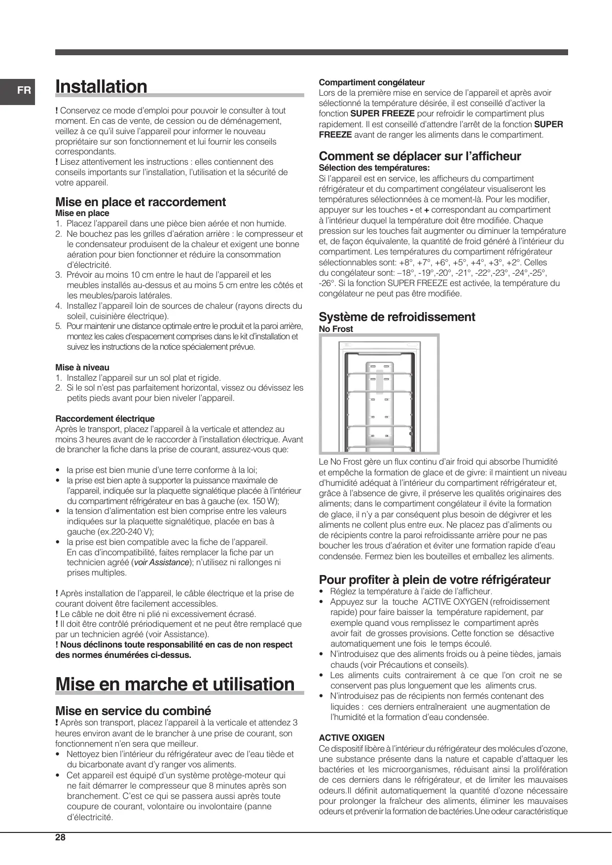 - Les aliments frais à congeler ne doivent pas être placés au contact d'aliments déjà congélés; il faut les stocker dans le compartiment supérieur CONGELATION et CONSERVATION où la température qui descend au-dessous de -18°C garantit une vitesse de congélation ajustée.