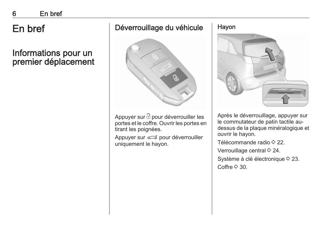 En bref En bref Déverrouillage du véhicule Hayon Appuyer sur c pour déverrouiller les portes et le coffre. Ouvrir les portes en tirant les poignées. Appuyer sur P pour déverrouiller uniquement le hayon. Après le déverrouillage, appuyer sur le commutateur de patin tactile audessus de la plaque minéralogique et ouvrir le hayon. Télécommande radio 3 22. Verrouillage central 3 24. Système à clé électronique 3 23. Coffre 3 30. Informations pour un premier déplacement En bref Réglage des sièges