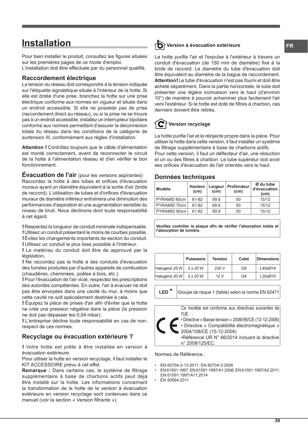 - Référence UR N° 66/2014 incluant la directive n° 2009/125/EC. Recyclage ou évacuation extérieure ? ! Votre hotte est prête à être installée en version à évacuation extérieure. Pour utiliser la hotte en version recyclage, il faut installer le KIT ACCESSOIRE prévu à cet effet. Remarque : Dans certains cas, le système de filtrage supplémentaire à base de charbons actifs peut déjà être installé sur la hotte. Les informations concernant la transformation de la hotte de la version à évacuation extérieure en version recyclage sont contenues dans ce manuel (voir la section « Version filtrante »). Groupe de risque 1 (faible) selon la norme EN 62471 Normes de Référence :