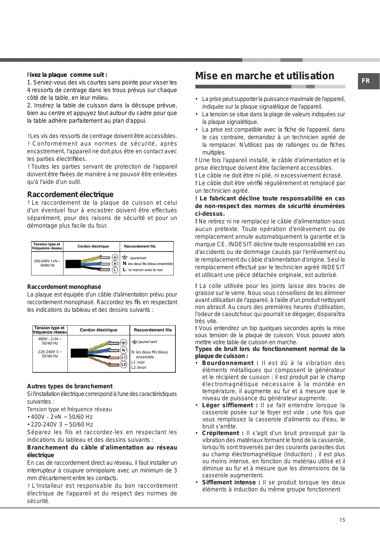 La plaque est équipée d'un câble d'alimentation prévu pour raccordement monophasé. Raccordez les fils en respectant les indications du tableau et des dessins suivants : Tension type et fréquence réseau