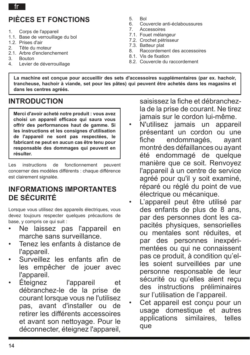 - Accessoires 7.1. Fouet mélangeur 7.2. Crochet pétrisseur 7.3. Batteur plat