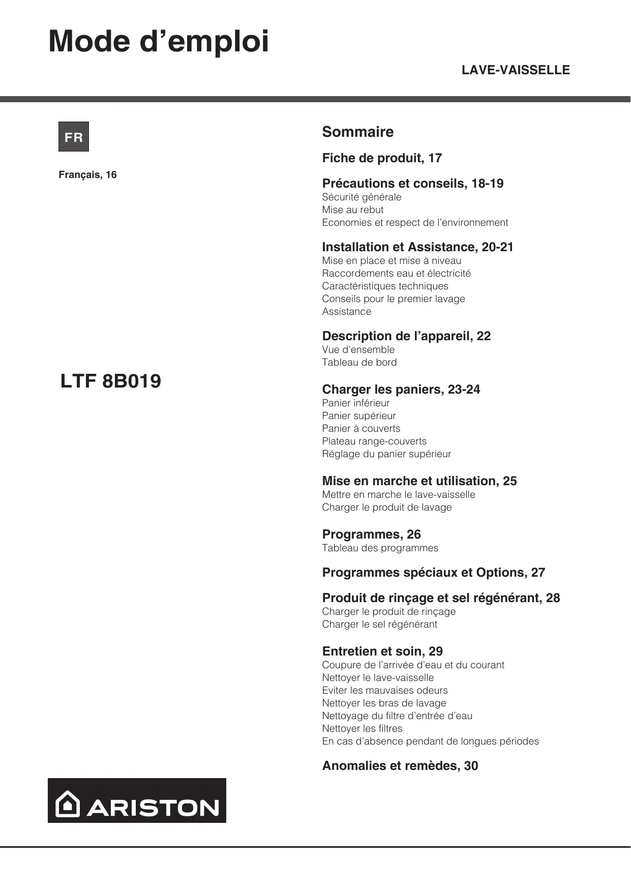 Sommaire Fiche de produit, 17 Français, 16 Précautions et conseils, 18-19 Sécurité générale Mise au rebut Economies et respect de l’environnement Installation et Assistance, 20-21 Mise en place et mise à niveau Raccordements eau et électricité Caractéristiques techniques Conseils pour le premier lavage Assistance Description de l’appareil, 22 Vue d’ensemble Tableau de bord LTF 8B019 Charger les paniers, 23-24 Panier inférieur Panier supérieur Panier à couverts Plateau range-couverts Réglage du panier supérieur Mise en marche et utilisation, 25 Mettre en marche le lave-vaisselle Charger le produit de lavage Programmes, 26 Tableau des programmes Programmes spéciaux et Options, 27 Produit de rinçage et sel régénérant, 28 Charger le produit de rinçage Charger le sel régénérant Entretien et soin, 29 Coupure de l’arrivée d’eau et du courant Nettoyer le lave-vaisselle Eviter les mauvaises odeurs Nettoyer les bras de lavage Nettoyage du filtre d’entrée d’eau Nettoyer les filtres En cas d’absence pendant de longues périodes Anomalies et remèdes, 30 Fiche de produit