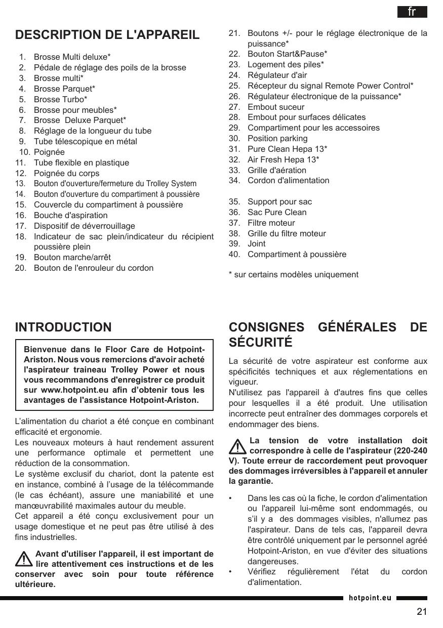 INTRODUCTION Bienvenue dans le Floor Care de HotpointAriston. Nous vous remercions d'avoir acheté l'aspirateur traineau Trolley Power et nous vous recommandons d'enregistrer ce produit sur www.hotpoint.eu afin d’obtenir tous les avantages de l'assistance Hotpoint-Ariston. L’alimentation du chariot a été conçue en combinant efficacité et ergonomie. Les nouveaux moteurs à haut rendement assurent une performance optimale et permettent une réduction de la consommation. Le système exclusif du chariot, dont la patente est en instance, combiné à l’usage de la télécommande (le cas échéant), assure une maniabilité et une manœuvrabilité maximales autour du meuble. Cet appareil a été conçu exclusivement pour un usage domestique et ne peut pas être utilisé à des fins industrielles. Avant d'utiliser l'appareil, il est important de lire attentivement ces instructions et de les conserver avec soin pour toute référence ultérieure.