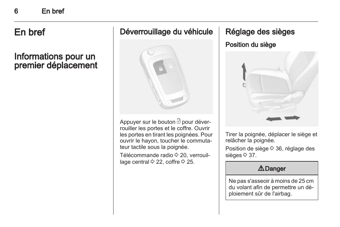 En bref En bref Déverrouillage du véhicule Réglage des sièges Position du siège Informations pour un premier déplacement Appuyer sur le bouton c pour déver‐ rouiller les portes et le coffre. Ouvrir les portes en tirant les poignées. Pour ouvrir le hayon, toucher le commuta‐ teur tactile sous la poignée. Télécommande radio 3 20, verrouil‐ lage central 3 22, coffre 3 25. Tirer la poignée, déplacer le siège et relâcher la poignée. Position de siège 3 36, réglage des sièges 3 37. 9 Danger Ne pas s'asseoir à moins de 25 cm du volant afin de permettre un dé‐ ploiement sûr de l'airbag. En bref