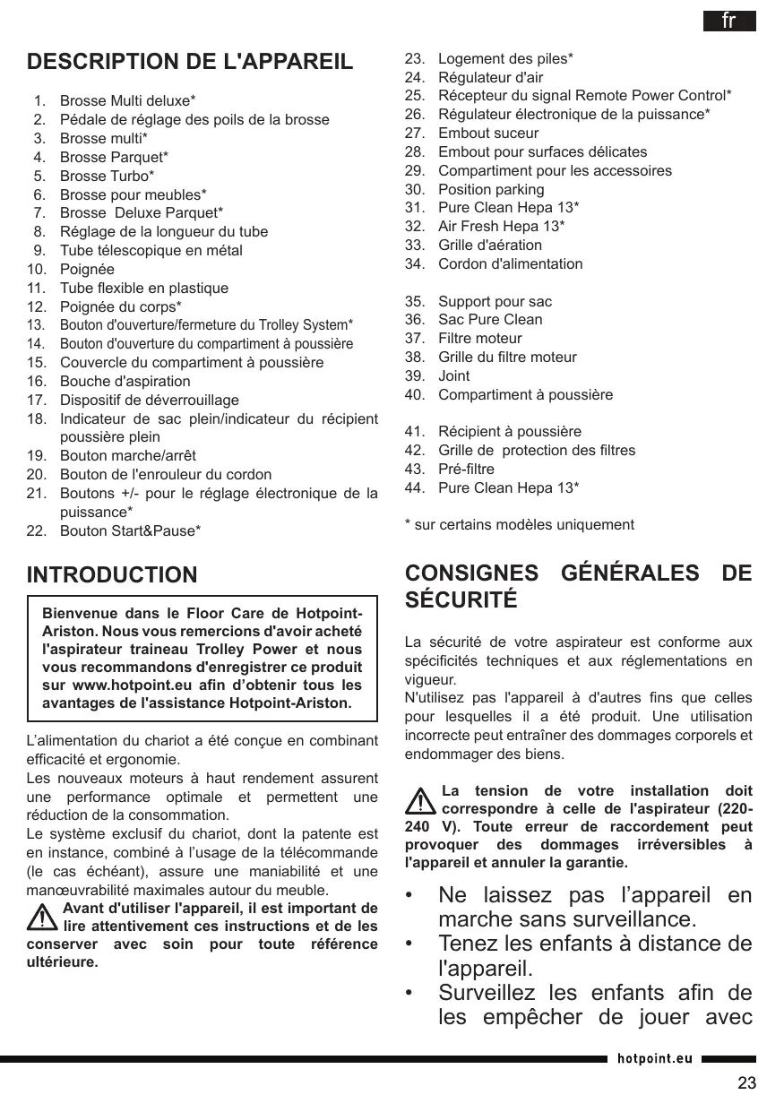 Brosse Multi deluxe* Pédale de réglage des poils de la brosse Brosse multi* Brosse Parquet* Brosse Turbo* Brosse pour meubles* Brosse Deluxe Parquet* Réglage de la longueur du tube Tube télescopique en métal Poignée Tube flexible en plastique Poignée du corps* Bouton d'ouverture/fermeture du Trolley System* Bouton d'ouverture du compartiment à poussière Couvercle du compartiment à poussière Bouche d'aspiration Dispositif de déverrouillage Indicateur de sac plein/indicateur du récipient poussière plein Bouton marche/arrêt Bouton de l'enrouleur du cordon Boutons +/- pour le réglage électronique de la puissance* Bouton Start&Pause* INTRODUCTION Bienvenue dans le Floor Care de HotpointAriston. Nous vous remercions d'avoir acheté l'aspirateur traineau Trolley Power et nous vous recommandons d'enregistrer ce produit sur www.hotpoint.eu afin d’obtenir tous les avantages de l'assistance Hotpoint-Ariston. L’alimentation du chariot a été conçue en combinant efficacité et ergonomie. Les nouveaux moteurs à haut rendement assurent une performance optimale et permettent une réduction de la consommation. Le système exclusif du chariot, dont la patente est en instance, combiné à l’usage de la télécommande (le cas échéant), assure une maniabilité et une manœuvrabilité maximales autour du meuble. Avant d'utiliser l'appareil, il est important de lire attentivement ces instructions et de les conserver avec soin pour toute référence ultérieure.