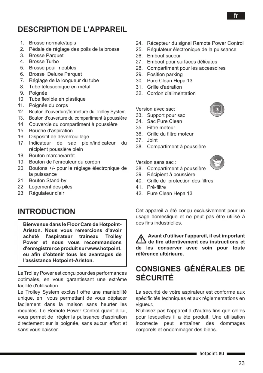 Brosse normale/tapis Pédale de réglage des poils de la brosse Brosse Parquet Brosse Turbo Brosse pour meubles Brosse Deluxe Parquet Réglage de la longueur du tube Tube télescopique en métal Poignée Tube flexible en plastique Poignée du corps Bouton d'ouverture/fermeture du Trolley System Bouton d'ouverture du compartiment à poussière Couvercle du compartiment à poussière Bouche d'aspiration Dispositif de déverrouillage Indicateur de sac plein/indicateur du récipient poussière plein Bouton marche/arrêt Bouton de l'enrouleur du cordon Boutons +/- pour le réglage électronique de la puissance Bouton Stand-by Logement des piles Régulateur d'air INTRODUCTION Bienvenue dans le Floor Care de HotpointAriston. Nous vous remercions d'avoir acheté l'aspirateur traineau Trolley Power et nous vous recommandons d'enregistrer ce produit sur www.hotpoint. eu afin d’obtenir tous les avantages de l'assistance Hotpoint-Ariston. Le Trolley Power est conçu pour des performances optimales, en vous garantissant une extrême facilité d'utilisation. Le Trolley System exclusif offre une maniabilité unique, en vous permettant de vous déplacer facilement dans la maison sans heurter les meubles. Le Remote Power Control quant à lui, vous permet de régler la puissance d'aspiration directement sur la poignée, sans aucun effort et sans vous baisser.