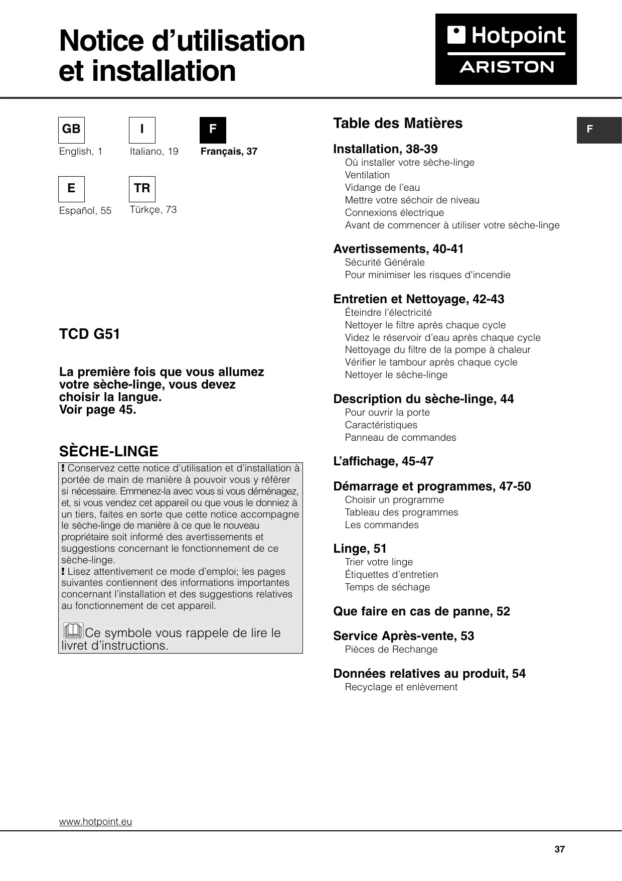 Retrouvez gratuitement la notice de l'appareil TCD G51 AX HOTPOINT au format PDF.
