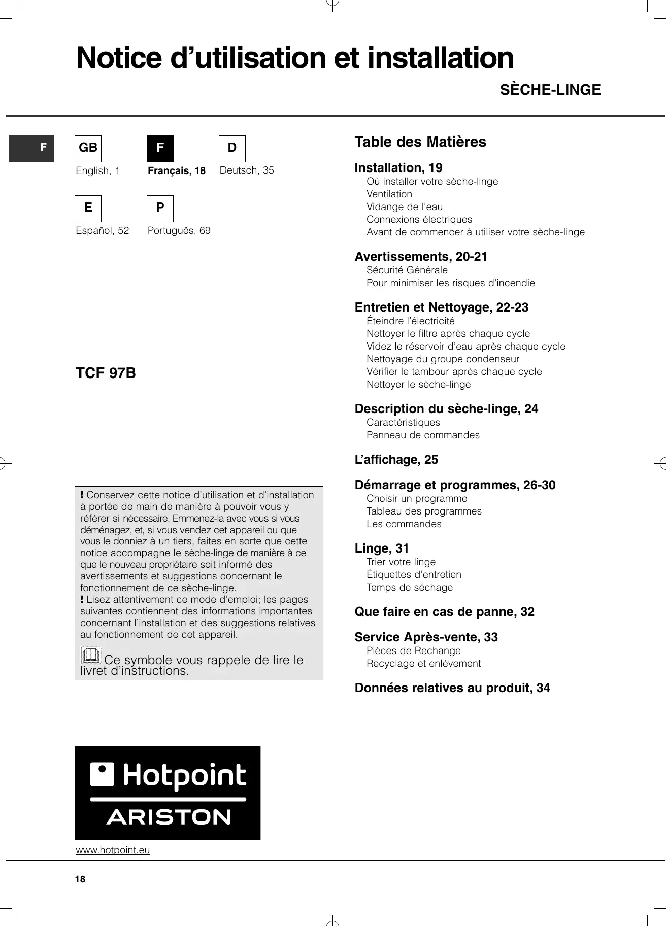 TCF 97B 6HY - Sèche-linge HOTPOINT - Notice d'utilisation et mode d'emploi gratuit