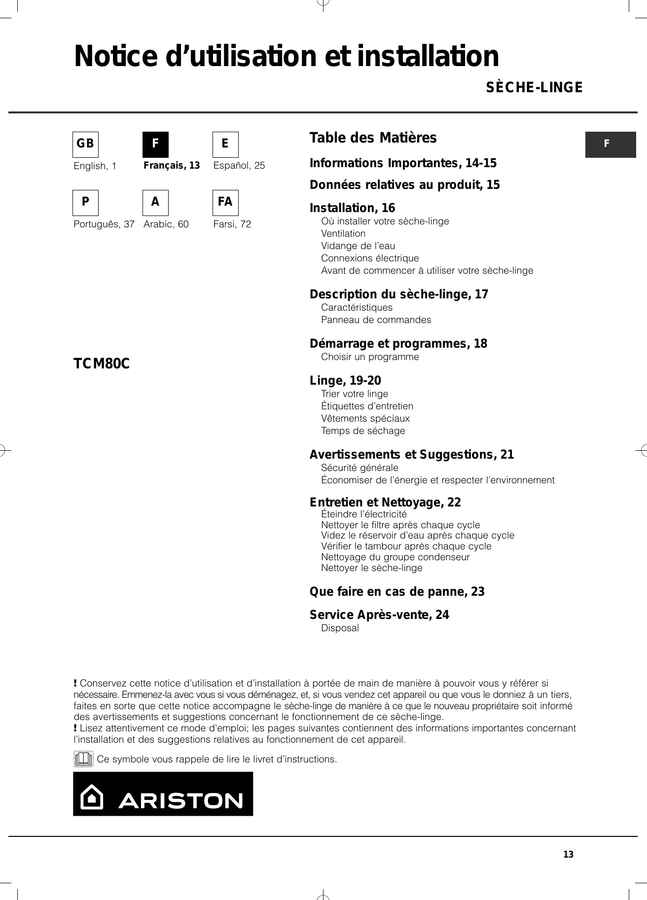 TCM80C 6P - Sèche-linge HOTPOINT - Notice d'utilisation et mode d'emploi gratuit