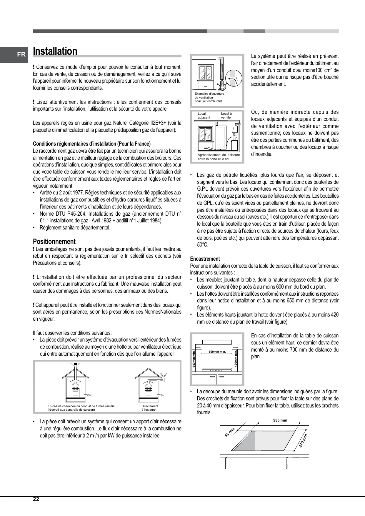 - La pièce doit prévoir un système d’évacuation vers l’extérieur des fumées de combustion, réalisé au moyen d’une hotte ou par ventilateur électrique qui entre automatiquement en fonction dès que l’on allume l’appareil. En cas d’installation de la table de cuisson sous un élément haut, ce dernier devra être monté à au moins 700 mm de distance du plan. Directement à l'externe 555 mm
