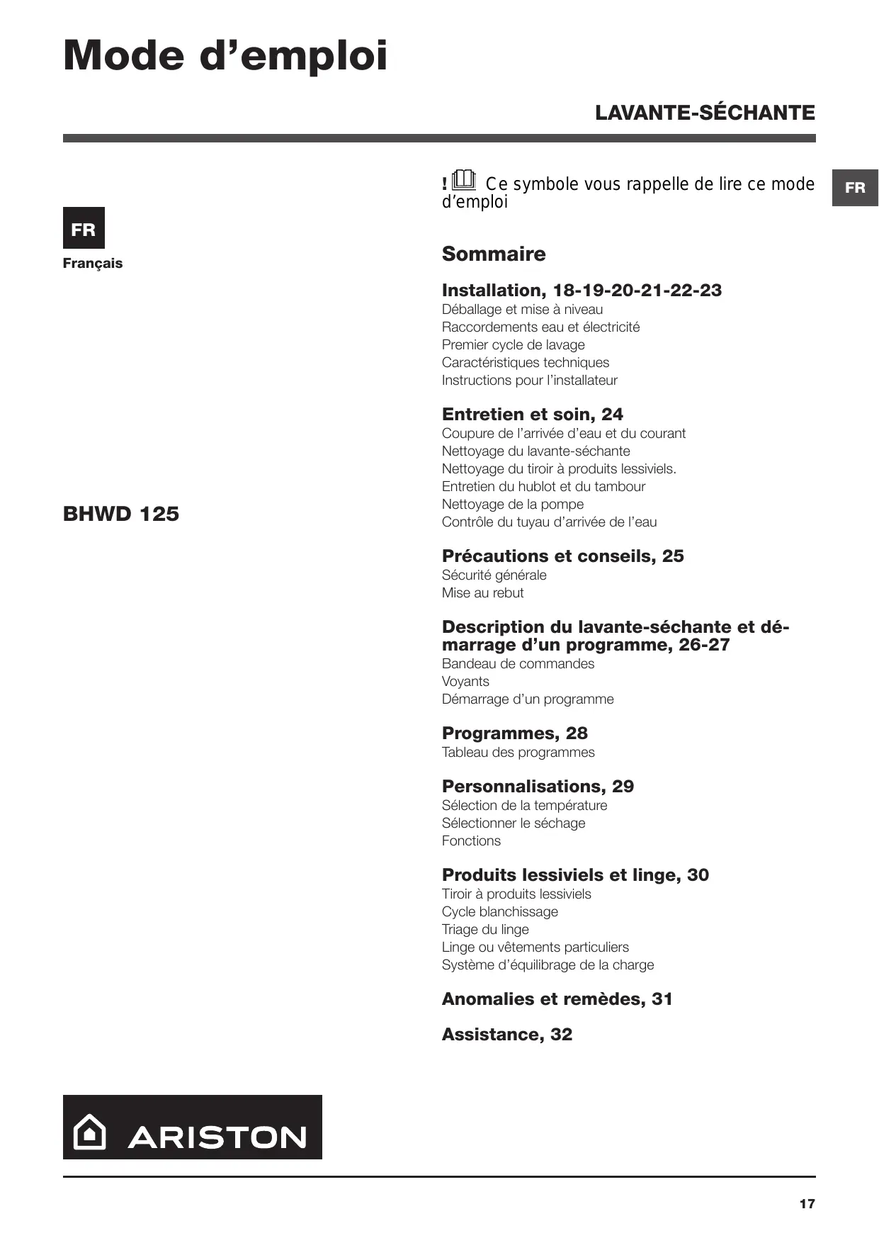 MODE D'EMPLOI BHWD 125 GCC HOTPOINT