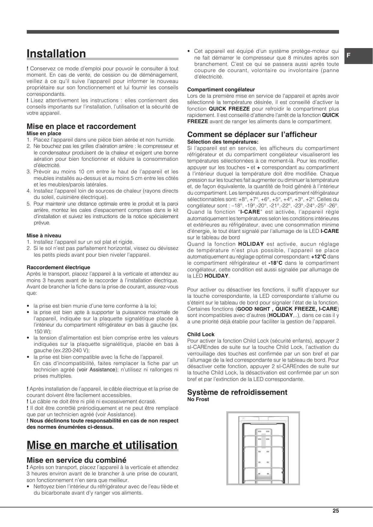 - Cet appareil est équipé d’un système protège-moteur qui ne fait démarrer le compresseur que 8 minutes après son branchement. C’est ce qui se passera aussi après toute coupure de courant, volontaire ou involontaire (panne d’électricité. Compartiment congélateur Lors de la première mise en service de l’appareil et après avoir sélectionné la température désirée, il est conseillé d’activer la fonction QUICK FREEZE pour refroidir le compartiment plus rapidement. Il est conseillé d’attendre l’arrêt de la fonction QUICK FREEZE avant de ranger les aliments dans le compartiment. Comment se déplacer sur l’afficheur Sélection des températures: Si l’appareil est en service, les afficheurs du compartiment réfrigérateur et du compartiment congélateur visualiseront les températures sélectionnées à ce moment-là. Pour les modifier, appuyer sur les touches - et + correspondant au compartiment à l’intérieur duquel la température doit être modifiée. Chaque pression sur les touches fait augmenter ou diminuer la température et, de façon équivalente, la quantité de froid généré à l’intérieur du compartiment. Les températures du compartiment réfrigérateur sélectionnables sont: +8°, +7°, +6°, +5°, +4°, +3°, +2°. Celles du congélateur sont : –18°, -19°,-20°, -21°,-22°, -23°,-24°,-25° -26°. Quand la fonction “I-CARE” est activée, l’appareil règle automatiquement les températures selon les conditions intérieures et extérieures au réfrigérateur, avec une consommation minime d’énergie, le tout étant signalé par l’allumage de la LED I-CARE sur le tableau de bord Quand la fonction HOLIDAY est activée, aucun réglage de température n’est plus possible, l’appareil se place automatiquement au réglage optimal correspondant: +12°C dans le compartiment réfrigérateur et -18°C dans le compartiment congélateur, cette condition est aussi signalée par allumage de la LED HOLIDAY. Pour activer ou désactiver les fonctions, il suffit d’appuyer sur la touche correspondante, la LED correspondante s’allume ou s’éteint sur le tableau de bord pour signaler l’état de la fonction. Certaines fonctions (GOOD NIGHT , QUICK FREEZE, I-CARE) sont incompatibles avec d’autres (HOLIDAY,..), dans ce cas il y a une priorité déjà établie pour faciliter la gestion de l’appareil. Child Lock Pour activer la fonction Child Lock (sécurité enfants), appuyer 2 sI-CAREndes de suite sur la touche Child Lock, l’activation du verrouillage des touches est confirmée par un son bref et par l’allumage de la led correspondante sur le tableau de bord. Pour désactiver cette fonction, appuyer 2 sI-CAREndes de suite sur la touche Child Lock, la désactivation est confirmée par un son bref et par l’extinction de la LED correspondante. Système de refroidissement No Frost Mise en marche et utilisation Mise en service du combiné ! Après son transport, placez l’appareil à la verticale et attendez 3 heures environ avant de le brancher à une prise de courant, son fonctionnement n’en sera que meilleur.