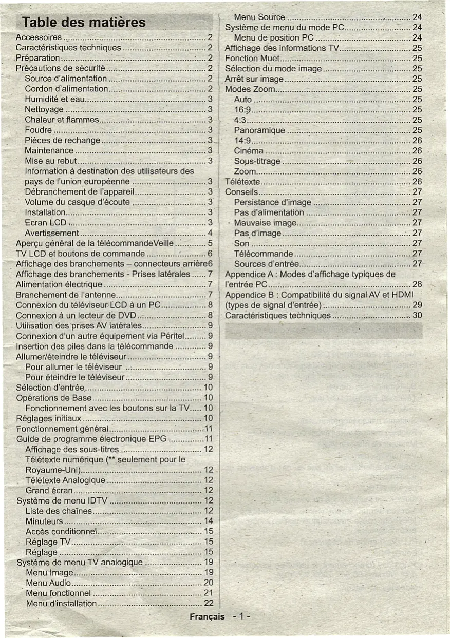 Télécommande Sources d'entrée.. Appendice A : Modes d'affichage typiques de l'entrée PC.. Appendice B : Compatibilité du signal AV et HDMI (types de signal d'entrée). Caractéristiques techniques .-. 30 Français - 1 - Accessoires Introduction Merci d'avojr choisi cet appareil. Ce manuel vous guidera pour une utilisation appropriée de f""\ votre téléviseur. Avant d'utiliser le téléviseur, \ lisez ce manuel minutieusement. Veuillez conserver ce manuel dans ur endroit sûr pour future référence. PILES NON INCLUSES