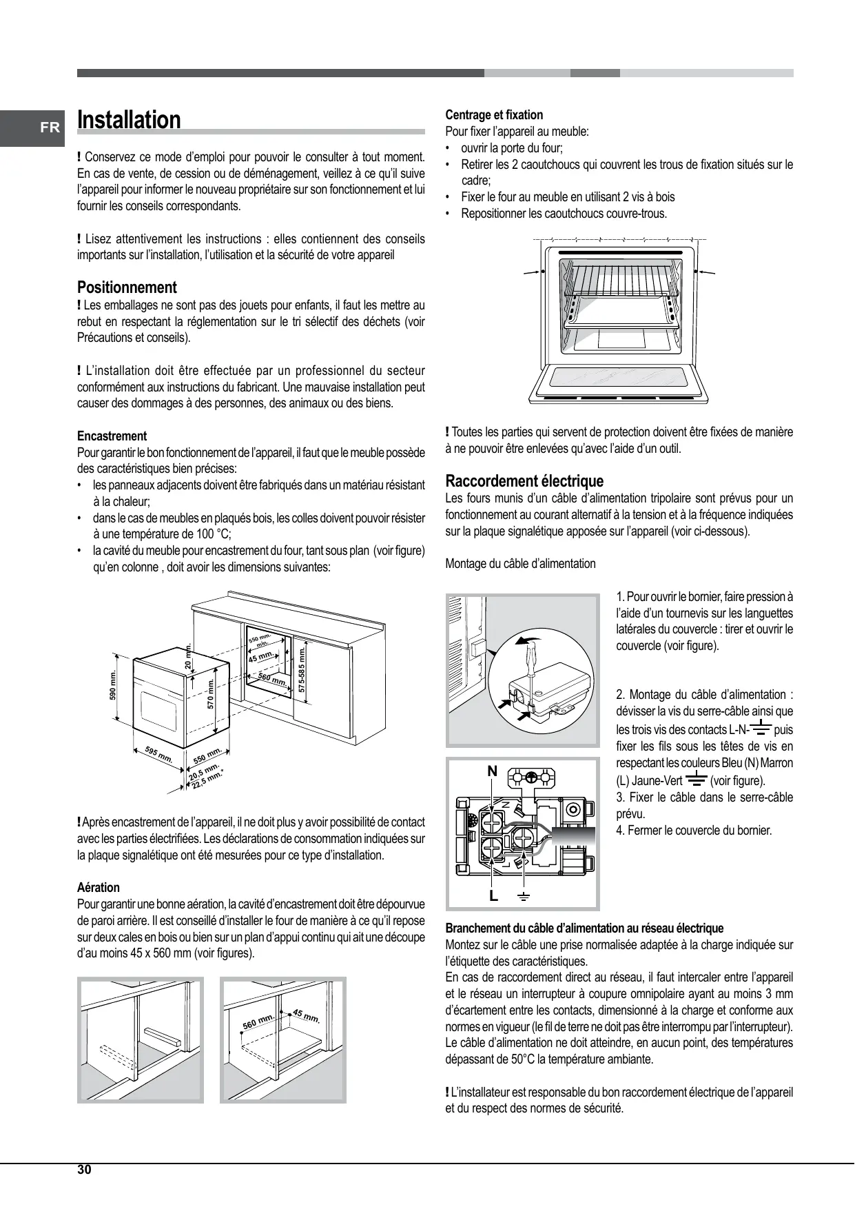 20 mm. 590 mm. ! Après encastrement de l’appareil, il ne doit plus y avoir possibilité de contact avec les parties électrifiées. Les déclarations de consommation indiquées sur la plaque signalétique ont été mesurées pour ce type d’installation. Aération Pour garantir une bonne aération, la cavité d’encastrement doit être dépourvue de paroi arrière. Il est conseillé d’installer le four de manière à ce qu’il repose sur deux cales en bois ou bien sur un plan d’appui continu qui ait une découpe d’au moins 45 x 560 mm (voir figures).