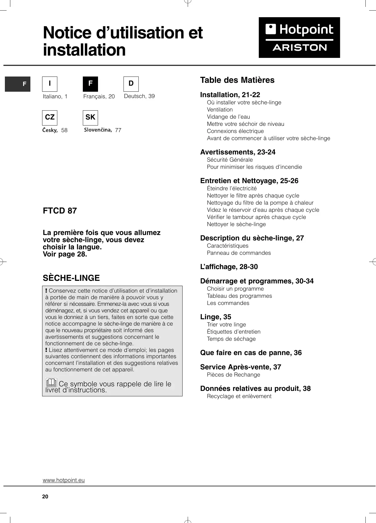 Retrouvez gratuitement la notice de l'appareil FTCD 871 6HY1 HOTPOINT au format PDF.