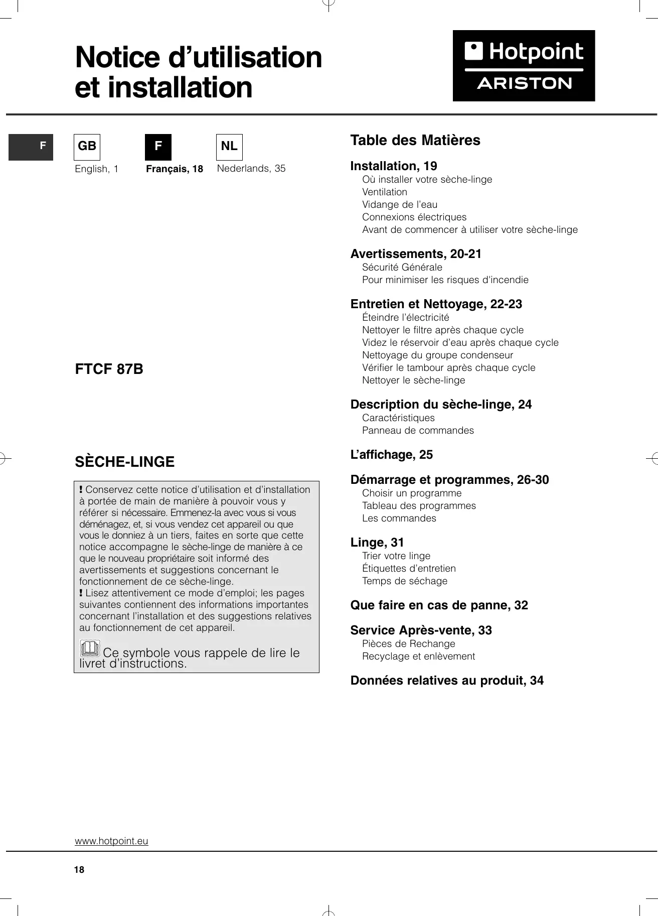 MODE D'EMPLOI FTCF 87B 6HY HOTPOINT