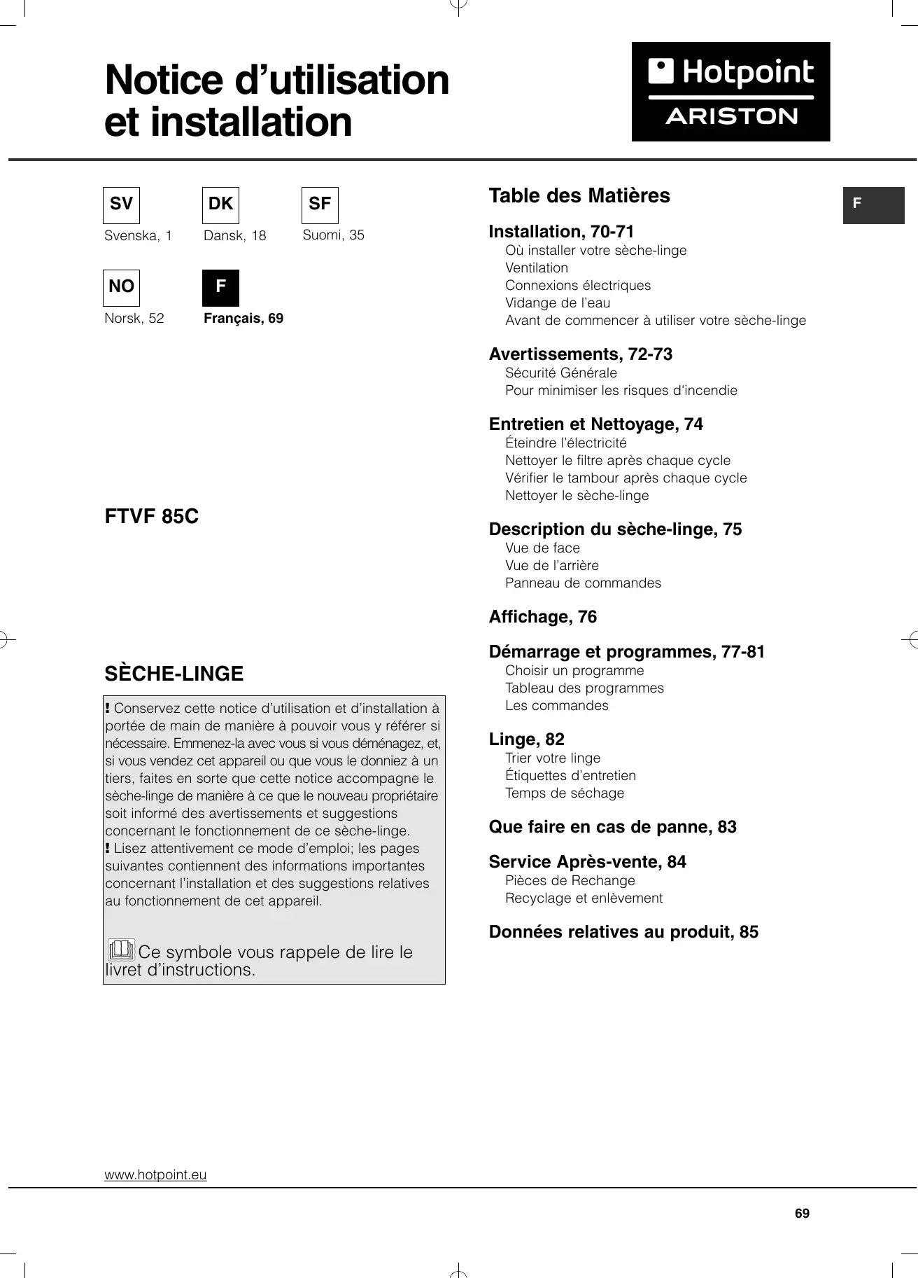MODE D'EMPLOI FTVF 85C P HOTPOINT