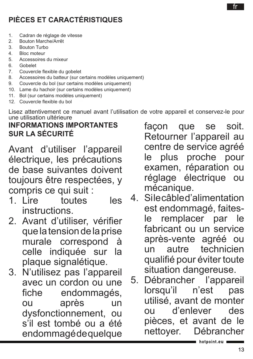 Cadran de réglage de vitesse Bouton Marche/Arrêt Bouton Turbo Bloc moteur Accessoires du mixeur Gobelet Couvercle flexible du gobelet Accessoires du batteur (sur certains modèles uniquement) Couvercle du bol (sur certains modèles uniquement) Lame du hachoir (sur certains modèles uniquement) Bol (sur certains modèles uniquement) Couvercle flexible du bol Lisez attentivement ce manuel avant l’utilisation de votre appareil et conservez-le pour une utilisation ultérieure façon que se soit. Retourner l’appareil au centre de service agréé Avant d’utiliser l’appareil le plus proche pour électrique, les précautions examen, réparation ou de base suivantes doivent réglage électrique ou toujours être respectées, y mécanique. compris ce qui suit :