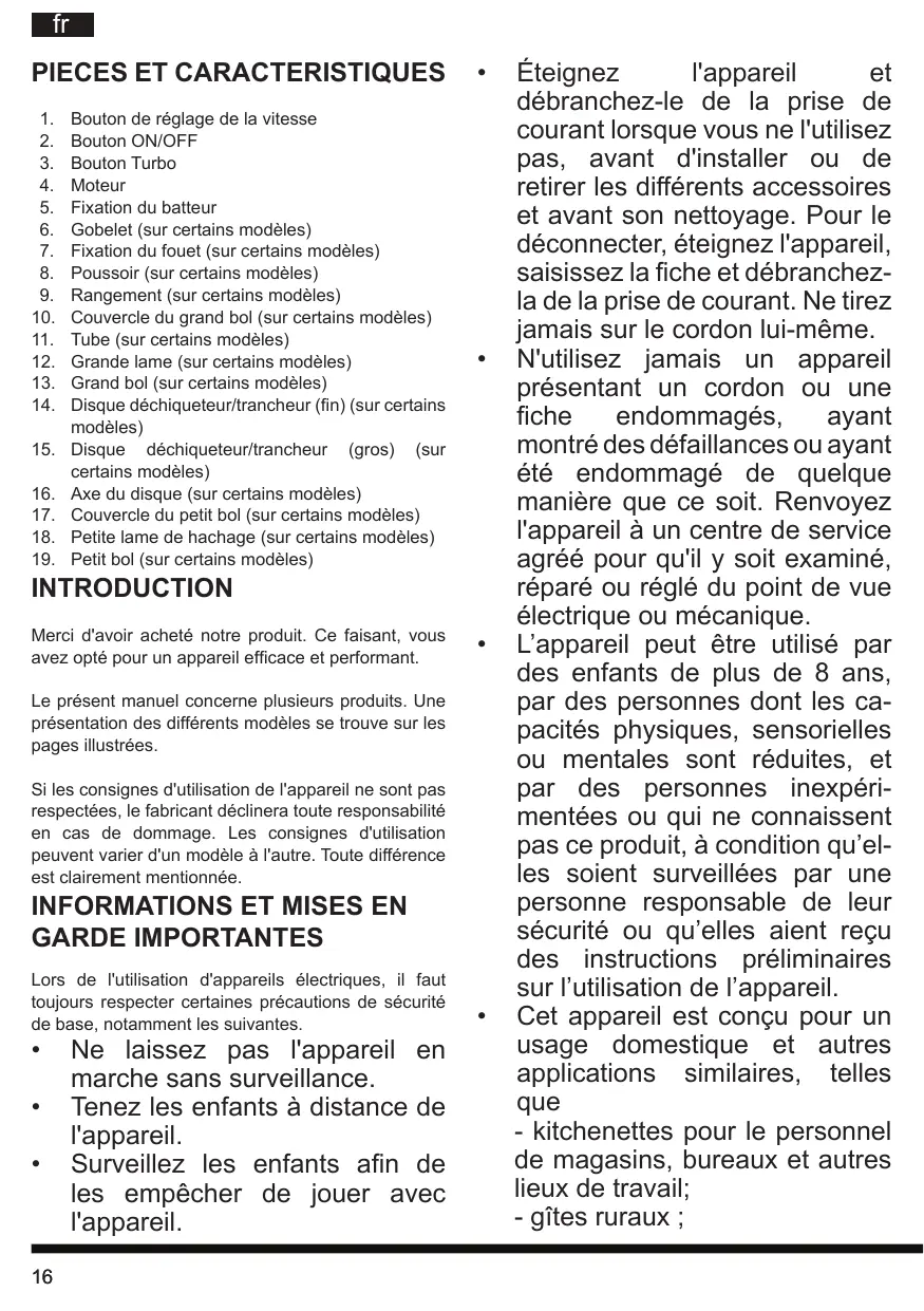 - clientèle d’hôtels, de motels ou autres logements de type résidentiel - hébergements type chambre d’hôtes. Les lames et le disque métalliques sont très coupants. Manipulez-les avec précaution. Maintenez toujours les fixations des lames à l’écart des bords tranchants lors de la manipulation et du nettoyage. Lisez la totalité des instructions. Conservez ces instructions. Avant toute utilisation, vérifiez si la tension de la prise correspond à celle figurant sur la plaque signalétique. N'utilisez pas l'appareil s'il est doté d'un cordon ou d'une fiche endommagée ou en cas de dysfonctionnement, si vous l'avez laissé tombé ou s'il présente des dégâts. Le cas échéant, apportez l'appareil chez le réparateur agréé le plus proche pour un examen, une réparation ou un réglage électrique ou mécanique. Si le cordon d'alimentation est endommagé, il doit être remplacé par le fabricant, le réparateur agréé ou un technicien qualifié afin d'éviter tout risque. Débranchez l'appareil lorsque vous ne l'utilisez pas, avant d'installer ou de retirer les différents accessoires et avant son nettoyage. Ne laissez pas le cordon pendre sur le bord de la table ni entrer en contact avec des surfaces chaudes. Ne plongez pas le moteur du mixeur dans l'eau car cela pourrait provoquer une électrocution. Evitez tout contact avec les éléments mobiles. Ecartez les mains et les ustensiles du récipient lorsque vous mixez pour éviter tout risque de blessure grave et les dégâts. Vous pouvez utiliser un grattoir mais ne devez l'utiliser que lorsque le mixeur est à l'arrêt. L'appareil ne peut pas être utilisé avec des produits durs et secs, car la lame pourrait s'émousser. Veillez à ce que le couvercle soit bien verrouillé en position avant de mettre l'appareil en marche. L'utilisation d'accessoires non recommandés par le fabricant peut provoquer des blessures ou des