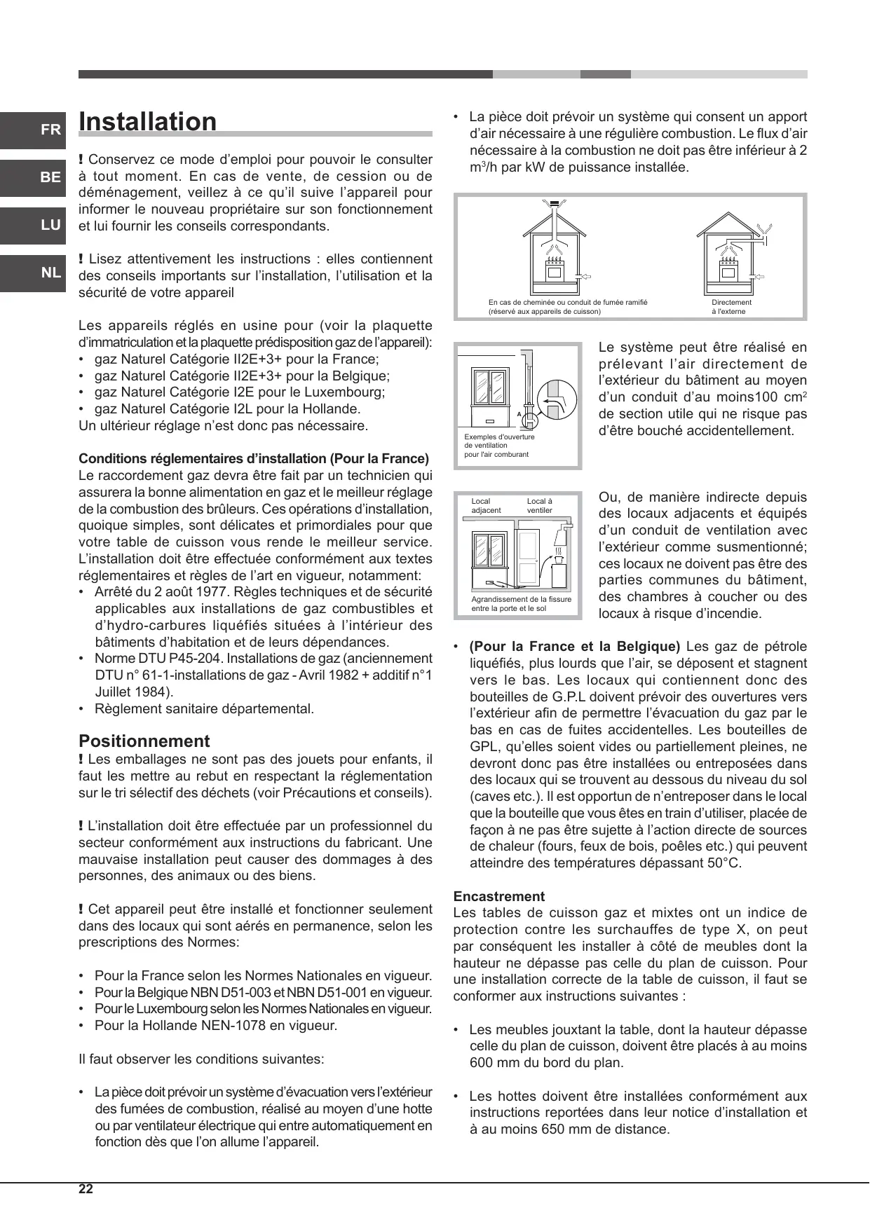DTU n° 61-1-installations de gaz - Avril 1982 + additif n°1 Juillet 1984). ! Cet appareil peut être installé et fonctionner seulement dans des locaux qui sont aérés en permanence, selon les prescriptions des Normes: