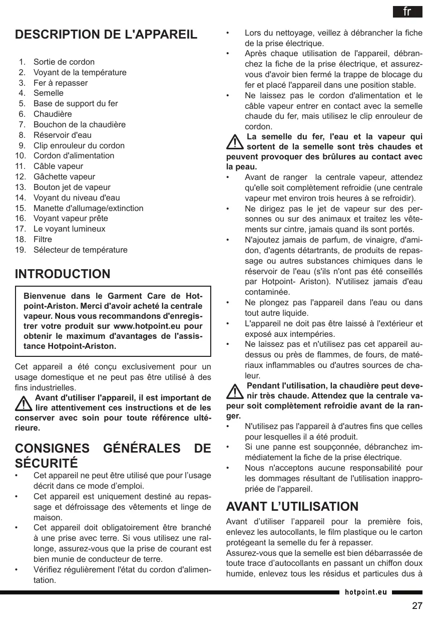 INTRODUCTION Bienvenue dans le Garment Care de Hotpoint-Ariston. Merci d'avoir acheté la centrale vapeur. Nous vous recommandons d'enregistrer votre produit sur www.hotpoint.eu pour obtenir le maximum d'avantages de l'assistance Hotpoint-Ariston. Cet appareil a été conçu exclusivement pour un usage domestique et ne peut pas être utilisé à des fins industrielles. Avant d'utiliser l'appareil, il est important de lire attentivement ces instructions et de les conserver avec soin pour toute référence ultérieure.