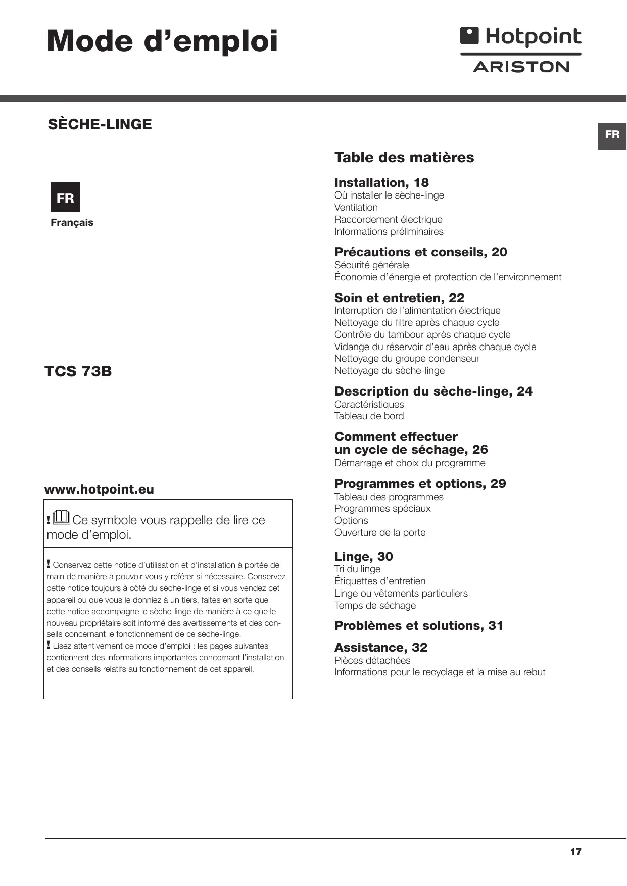 MODE D'EMPLOI TCS 73B GP HOTPOINT
