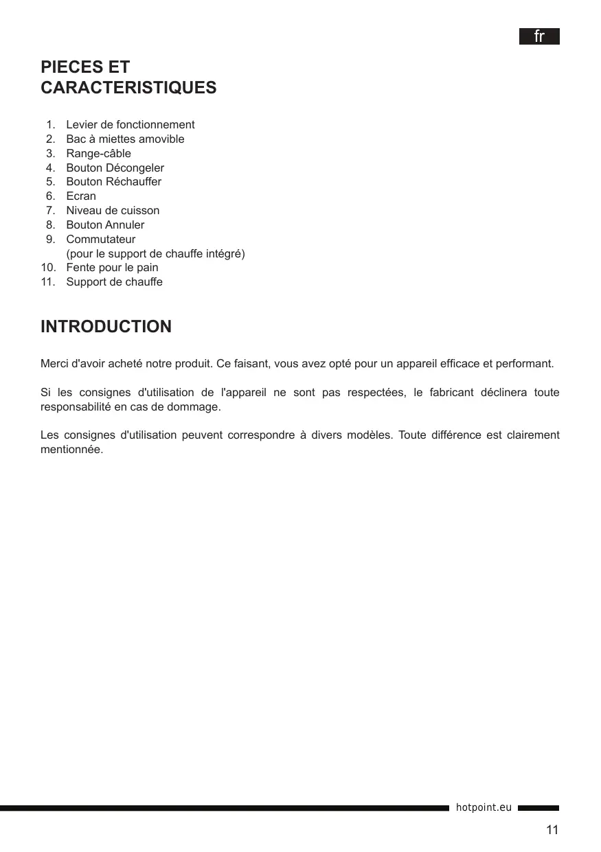 INTRODUCTION Merci d'avoir acheté notre produit. Ce faisant, vous avez opté pour un appareil efficace et performant. Si les consignes d'utilisation de l'appareil ne sont pas respectées, le fabricant déclinera toute responsabilité en cas de dommage. Les consignes d'utilisation peuvent correspondre à divers modèles. Toute différence est clairement mentionnée. hotpoint.eu