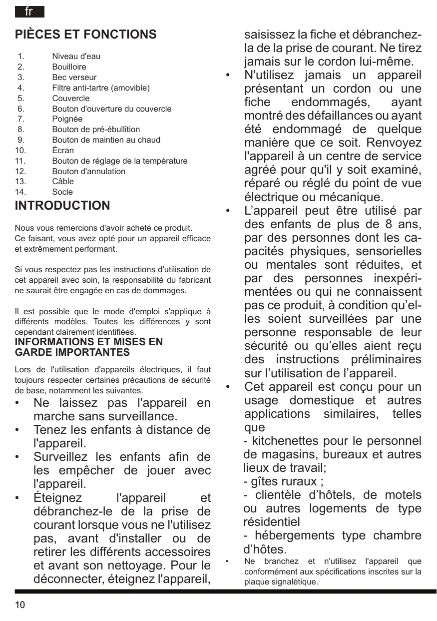 saisissez la fiche et débranchezla de la prise de courant. Ne tirez jamais sur le cordon lui-même. N'utilisez jamais un appareil présentant un cordon ou une fiche endommagés, ayant montré des défaillances ou ayant été endommagé de quelque manière que ce soit. Renvoyez l'appareil à un centre de service agréé pour qu'il y soit examiné, réparé ou réglé du point de vue électrique ou mécanique. L’appareil peut être utilisé par des enfants de plus de 8 ans, par des personnes dont les capacités physiques, sensorielles ou mentales sont réduites, et par des personnes inexpérimentées ou qui ne connaissent pas ce produit, à condition qu’elles soient surveillées par une personne responsable de leur sécurité ou qu’elles aient reçu des instructions préliminaires sur l’utilisation de l’appareil. Cet appareil est conçu pour un usage domestique et autres applications similaires, telles que - kitchenettes pour le personnel de magasins, bureaux et autres lieux de travail; - gîtes ruraux ; - clientèle d’hôtels, de motels ou autres logements de type résidentiel - hébergements type chambre d’hôtes. Ne branchez et n'utilisez l'appareil que conformément aux spécifications inscrites sur la plaque signalétique.