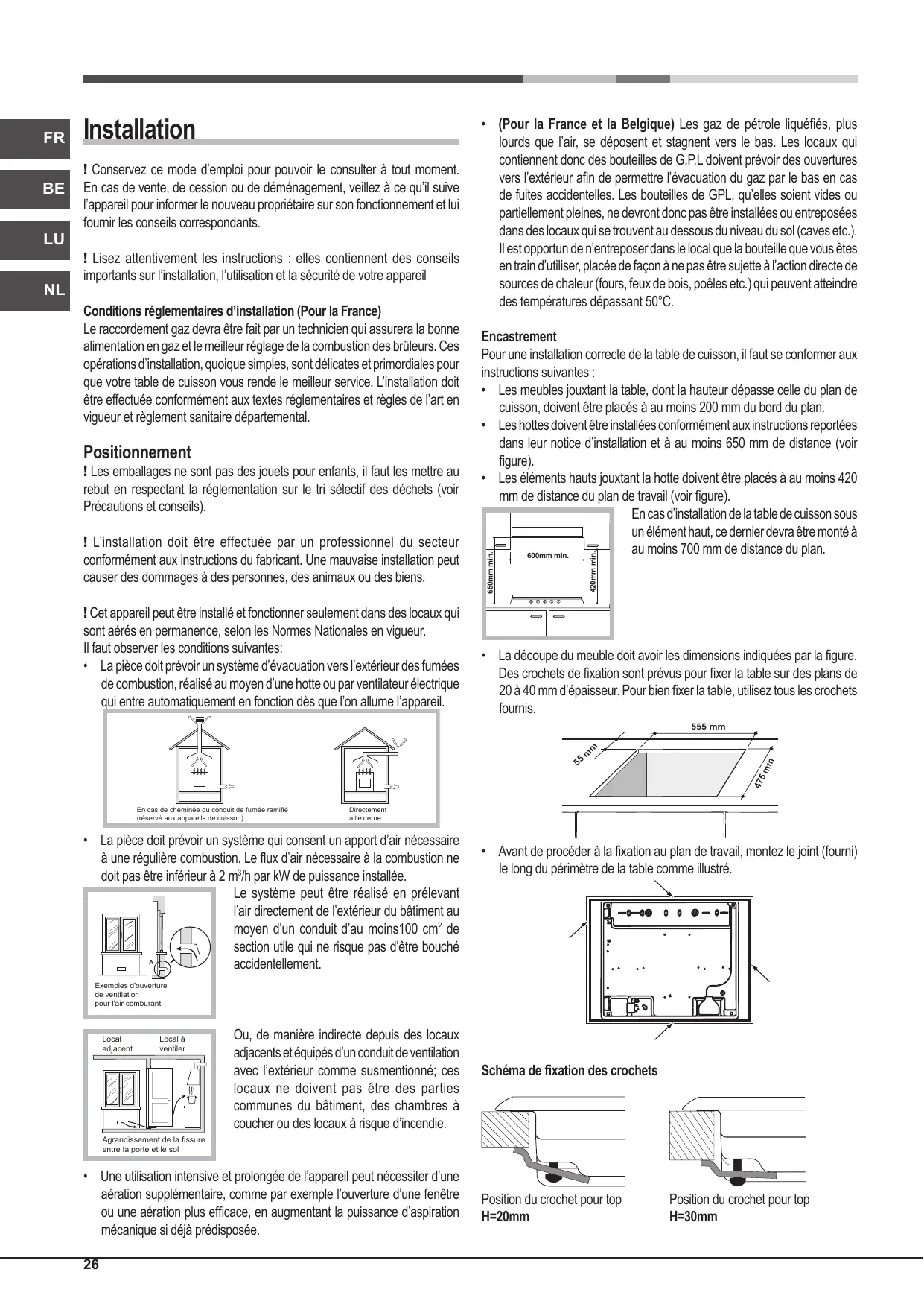 - Avant de procéder à la fixation au plan de travail, montez le joint (fourni) le long du périmètre de la table comme illustré. Exemples d'ouverture de ventilation pour l'air comburant Local adjacent Local à ventiler Ou, de manière indirecte depuis des locaux adjacents et équipés d’un conduit de ventilation avec l’extérieur comme susmentionné; ces locaux ne doivent pas être des parties communes du bâtiment, des chambres à coucher ou des locaux à risque d’incendie. Schéma de fixation des crochets Agrandissement de la fissure entre la porte et le sol
